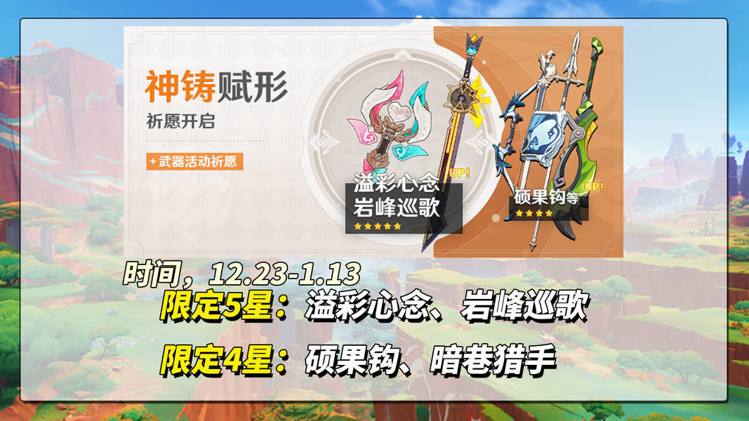「溢彩心念、岩峰巡歌、硕果钩、暗巷猎手、西风剑、西风长枪、流浪乐章」其中前4把是限定武器,只能在UP池抽到,常驻池没有。