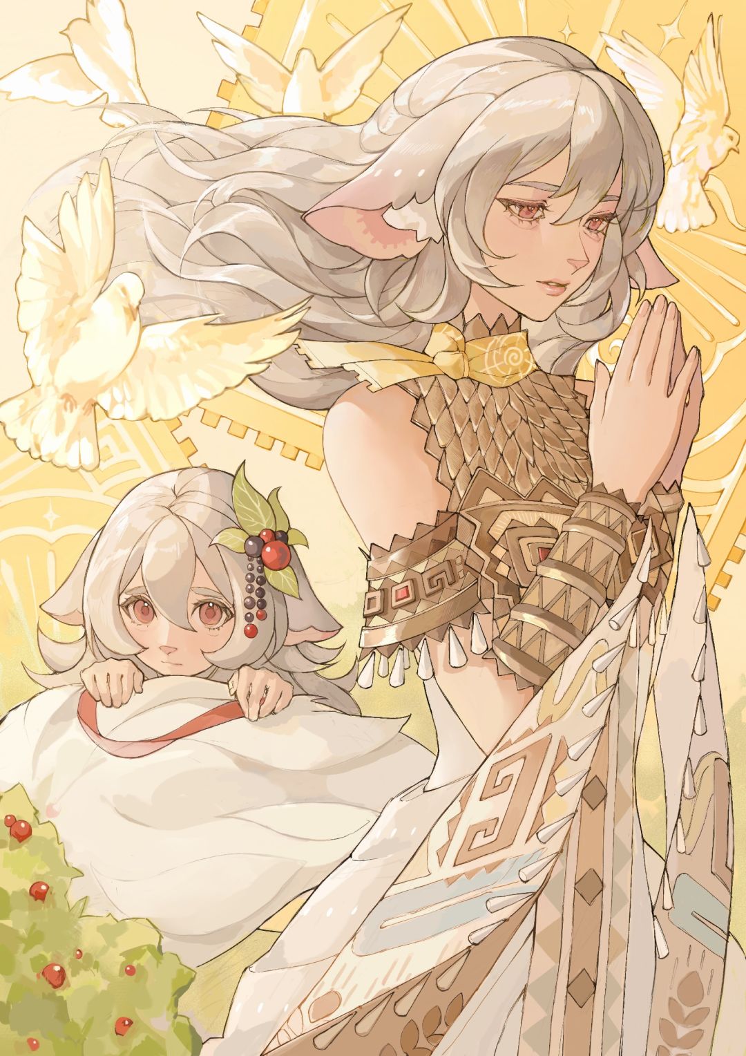 暖金色的光辉勾勒出加拉蓬松的毛发与洁白的兽耳,鎏金纹路的衣饰仿佛凝结了阳光的肌理。她双手合十,虔诚地沐浴在神圣的光晕中。