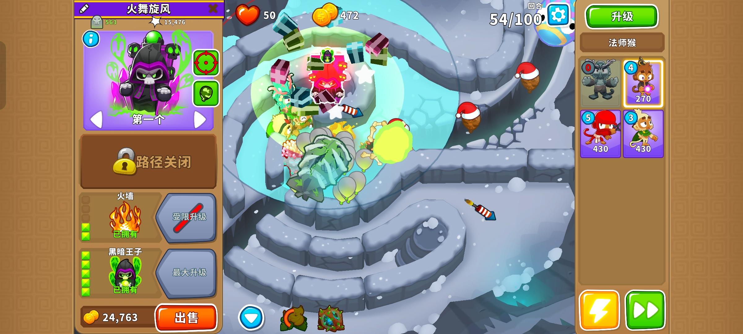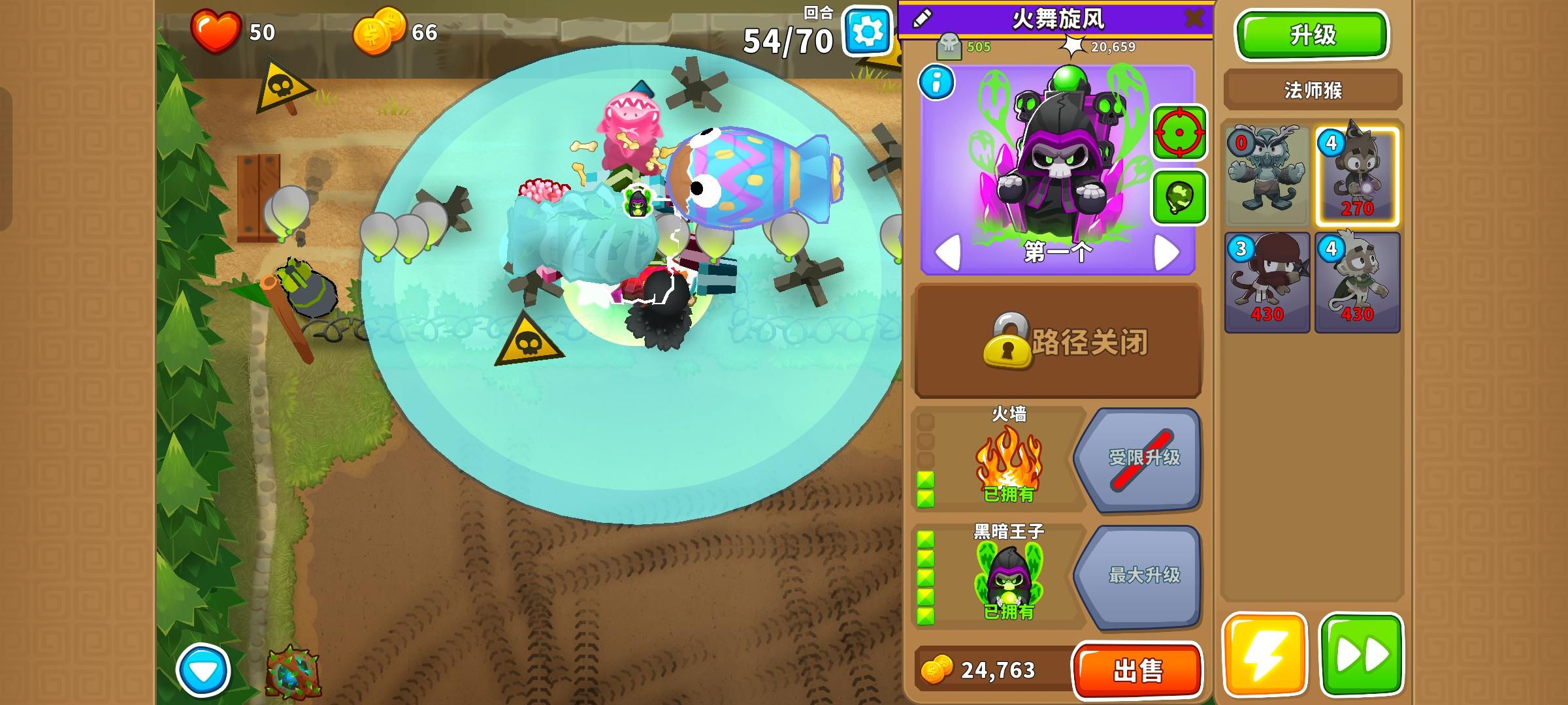 岛4:开局清障碍,并将022法师猴和100忍者猴放在图上位置,之后先升忍者之201,再在法师旁边放下英雄,钱够就升级法师至024。对付MOAB时先把亡灵气球复活地设置在图上位置,再补个013德鲁伊,再将忍者升级至202并再补个202忍者,最后使用英雄技能就行(当然可以放更多猴子以防万一)。成功后再取消亡灵气球复活地,最后升级至025法师猴就行!