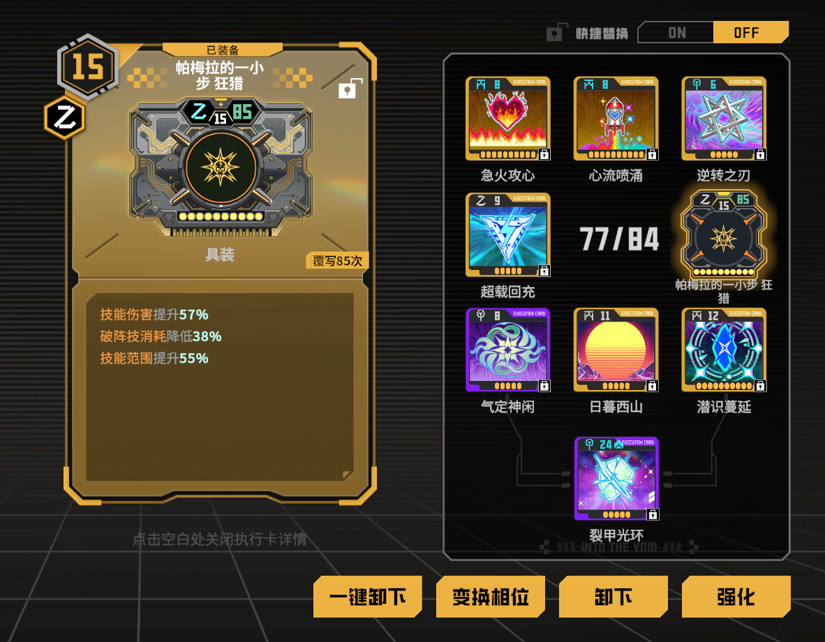 第二套配卡(非永续):考虑到紫卡随机性较强不是所有人都能刷出自回和减耗,以下提出其他角色紫卡属性推荐:技能伤害(破阵)/技能范围(破阵)>技能持续(信手) 持续的优先级最低,建议当作附赠属性