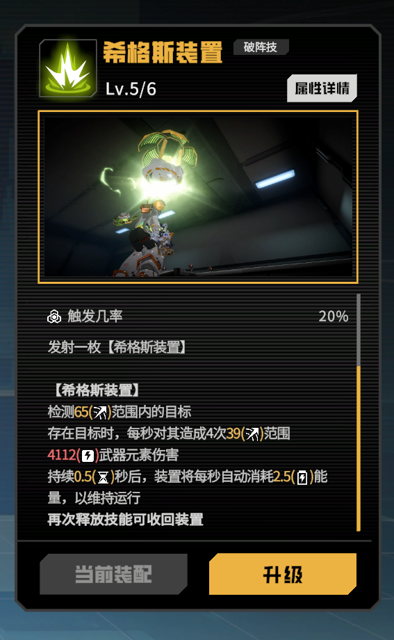 开启该技能后,发射一枚装置,该装置会检索范围内的目标,检索到目标后会对目标造成武器元素伤害,运行若干秒后,会每秒消耗能量继续运行,再次点击该技能收回装置