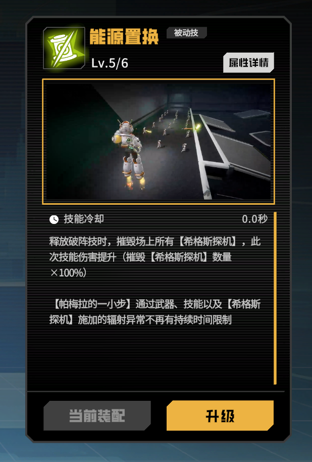 丢出探机很重要的原因在此,施放破阵技后摧毁场上所有的探机并提升(摧毁探机数量×最高120%)技能伤害,该提升(在不堆额外生命值且探机上限只有五个的情况下)的具体公式为 原技能伤害面板×摧毁探机数量×最高120%所以在开启破阵技前,要尽量丢出探机增加破阵技的伤害,又因为消耗能量即可继续运行,综上该操作仅需开局进图时操作一次!