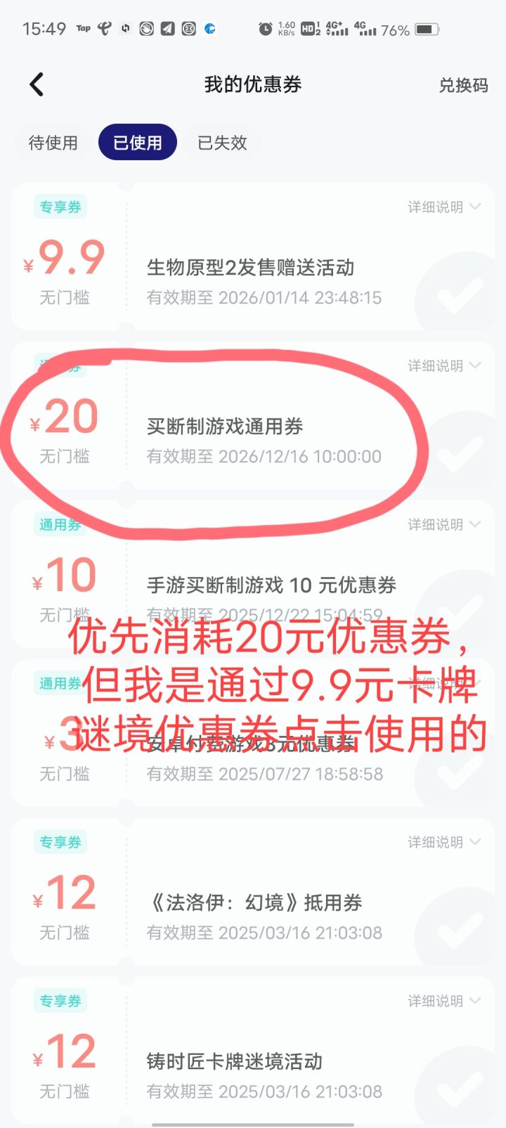 本人在很久之前买过我的水世界求生,后面游戏下架了,所以向tap客服反馈,补偿了20元优惠券用于购买其他游戏,在近几天本人也参与了购买生物原型2送卡牌秘境的活动,仓库送了一个9.9元的卡牌秘境兑换券,所以本人通过此优惠券点击使用,下一个页面显示游戏价格为0,直接提交了,后面才发现优先消耗的是补偿的20元优惠券,本人咨询过好几个客服,