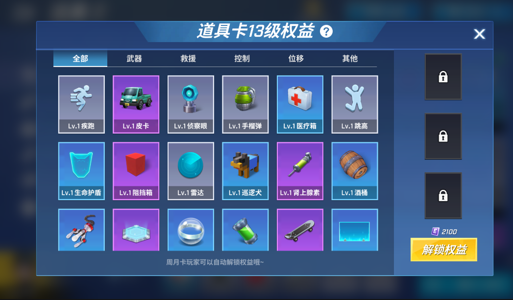 2.周卡月卡免费解锁:订阅用户可免费解锁13级道具卡,权益有效期与已开通的周卡/月卡剩余时长一致;若订阅时已使用点券解锁该权益,则时间不叠加、点券无法返还,少年们在开通前请仔细看清楚哦!