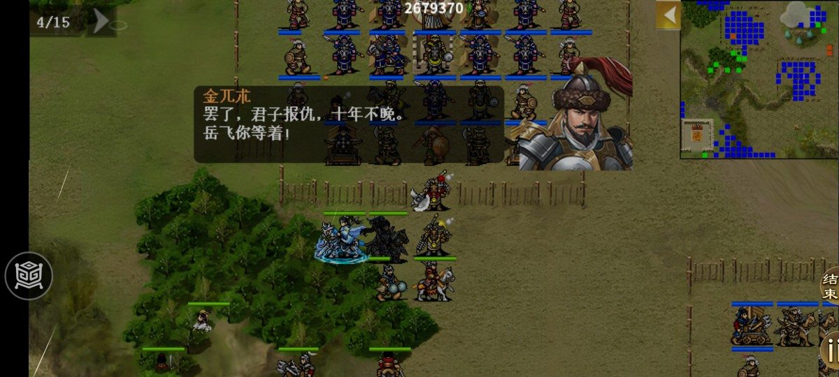 ※本关逃课,为了30积分折磨自己不至于!击退敌将,占领兵营无药品,何必呢?雨天4回合速通之!!岳飞站(9.9)往敌营扔个张保,引金兀术出战,下回合击退过关。由于一次性消失很多敌兵,会假死机几分钟,耐心等待。想挑战的话,下方交给狄雷吧,会离队。如果压级导致岳飞不到20级,不能往敌营扔张保,可以派人从敌营后方进攻。还有绝招,可以带双铁戟把金弹子推开,正面强攻!