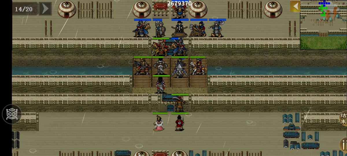 选择2,20回合,计策成功,岳云、张宪进城杀几个小兵,岳银瓶加全buff,我军和援军出战。回合结束,左下敌援军出现,下面同一,韩世忠七回合出战。全灭敌军回合紧张。