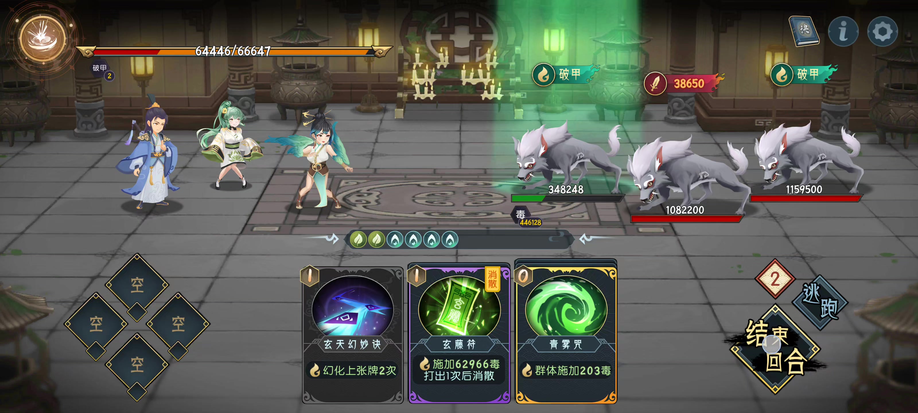 如:楚青青的玄天幽藤符毒量为157416,玄藤符毒量为62966,鸠真真的青雾咒为群体施加203毒,假设有3只怪物,单体毒全部施加给A,那么此时怪物A的毒量为157416+62966+203=220585,怪物B、C的毒量为203,对怪物A使用归一决,此时怪物A身上毒量为220585+203+203=220991。