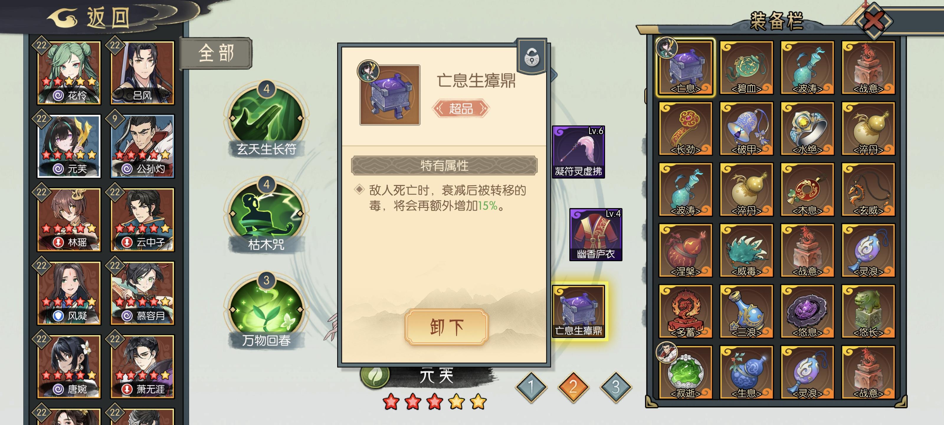 这个饰品很好理解,正常毒的结算流程为:毒爆→毒衰减→传递毒→毒爆→毒衰减,而亡息生瘴鼎的生效时间在传递毒这一步,具体算法为传递毒量*1.15。