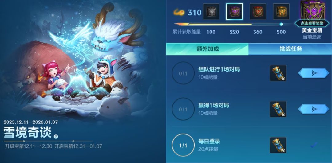 升级宝箱领史诗皮肤!截止至2026年1月7日,召唤师完成活动任务升级宝箱,即可于12月31日开箱最高免费获得随机一款史诗皮肤~