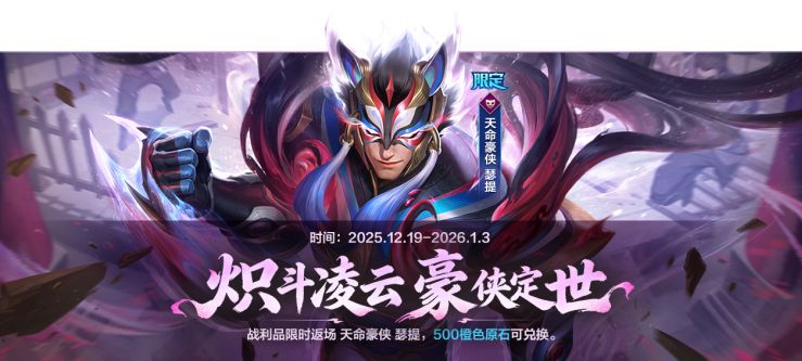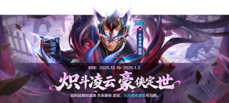 12月19日(明日)11:00-2026年1月3日23:59,限定皮肤-天命豪侠 瑟提限时返场战利品兑换商城,心仪的召唤师可使用橙色原石*500进行兑换~