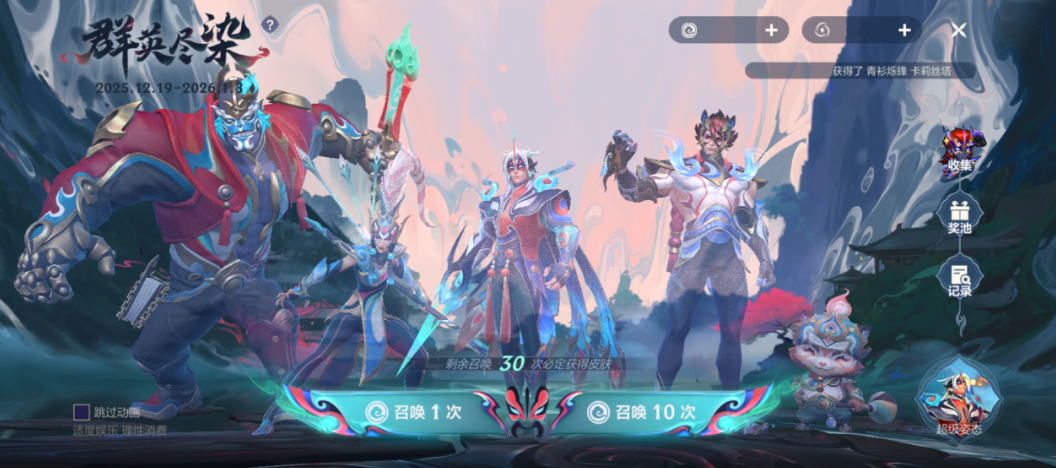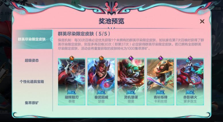 3、保底机制说明:每召唤30次必定优先获取1个未拥有的群英尽染限定皮肤,如召唤师在第7次召唤时获得了群英尽染限定皮肤,则至多再召唤30次(即第37次)必定获得群英尽染限定皮肤。