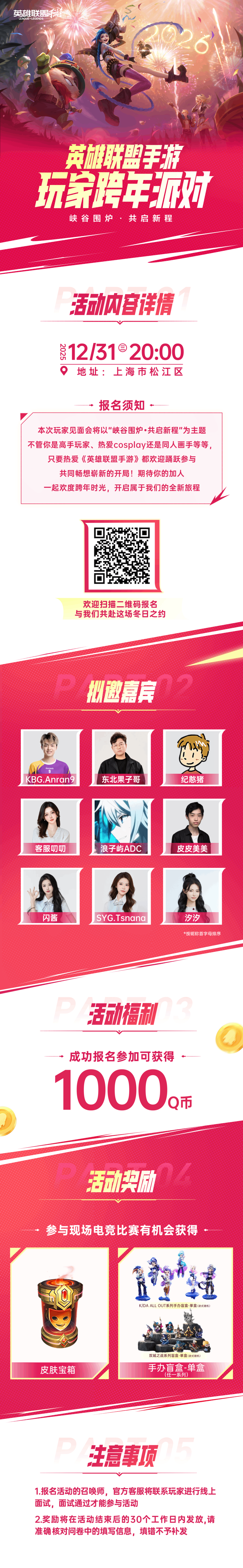 召唤师可上下滑动长图查看全部内容,同时扫描下方长图中的二维码即可进行报名,成功报名参加还可获得1000企鹅币奖励!快来一起把跨年玩出峡谷味儿吧~