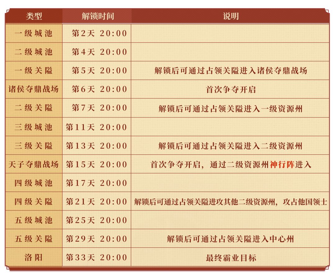 赛季中各类城池、关隘、战场将按时间逐步解锁,解锁后方可攻打,合理规划进攻节奏至关重要: