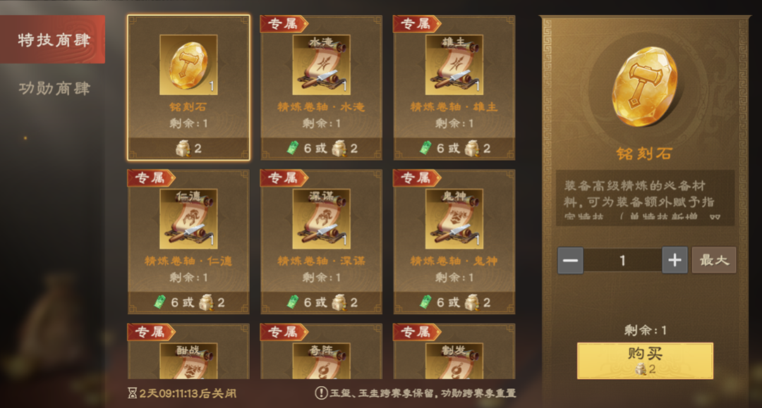 赛季商店将在S3开服后立刻开启,新增了部分武将专属特技卷轴以及铭刻石,诸位主公可根据自己的阵容需要进行兑换。