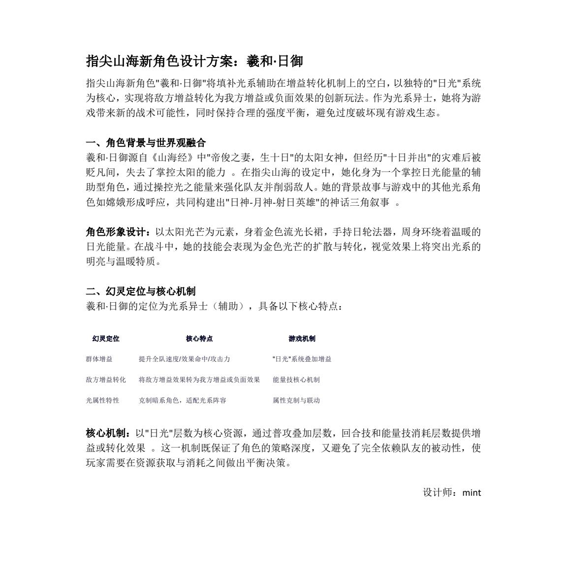 很荣幸参与《指尖山海》新英雄创意征集活动!我以山海经神话为灵感,设计了光系辅助角色「羲和·日御」——她能将敌方增益转化为己方优势,用日光之力守护队友、扭转战局。期待我的创意能为游戏世界增添一抹新的光芒!英雄详情请见图片。(角色立绘用了AI辅助)