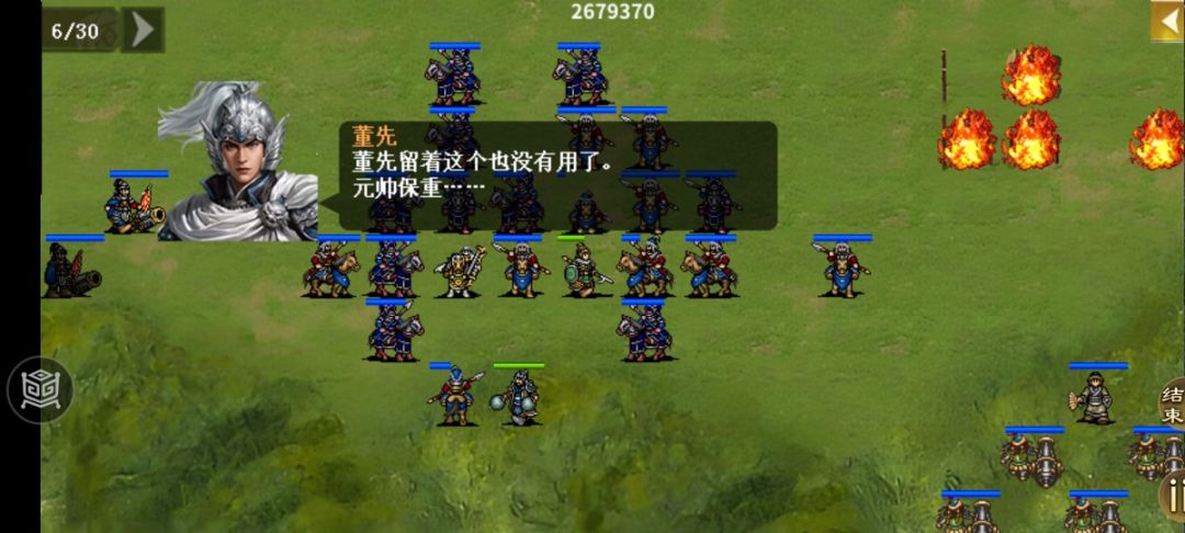 开局岳银瓶诸葛英余化龙往上走,去攻打金兀术,岳飞李娃牛皋杨虎何元庆张显玩左走准备会合董先。三回合董先出战,回合结束选项:1.分兵救援董先2.先全歼铁浮陀。选一张显何元庆消失去支援,选二保持原阵型。董先(照胆剑瘊子甲飞爪)自己完全没问题。五回合,张显何元庆左下支援董先。何元庆对话董先,三人加攻。岳飞部靠近下方铁浮陀营地,银眼大磨伏兵出现,稳住阵脚慢慢打。岳银瓶部清完金兀术部赶往上方铁浮陀营地,山上有金眼大磨伏兵,注意诸葛英余化龙远攻的安全距离。中间有火的营地不能进入,周围也不行,铁浮陀炮轰麻痹,而且是每回合。何元庆单挑完木陀泽,张显单挑完木陀赤(血量低于一半)后,三人回援攻打铁浮陀。全灭过关,得辽东马。