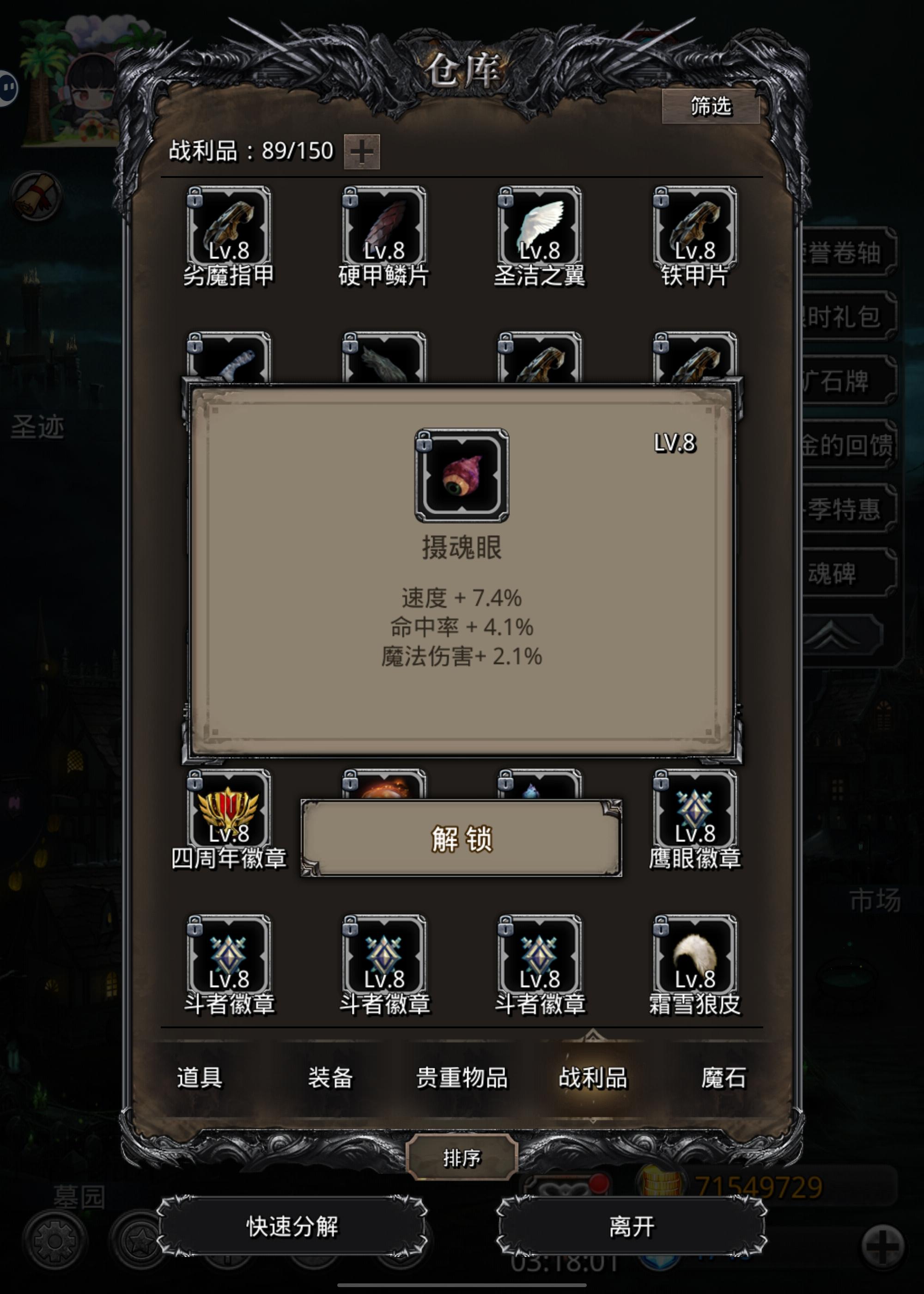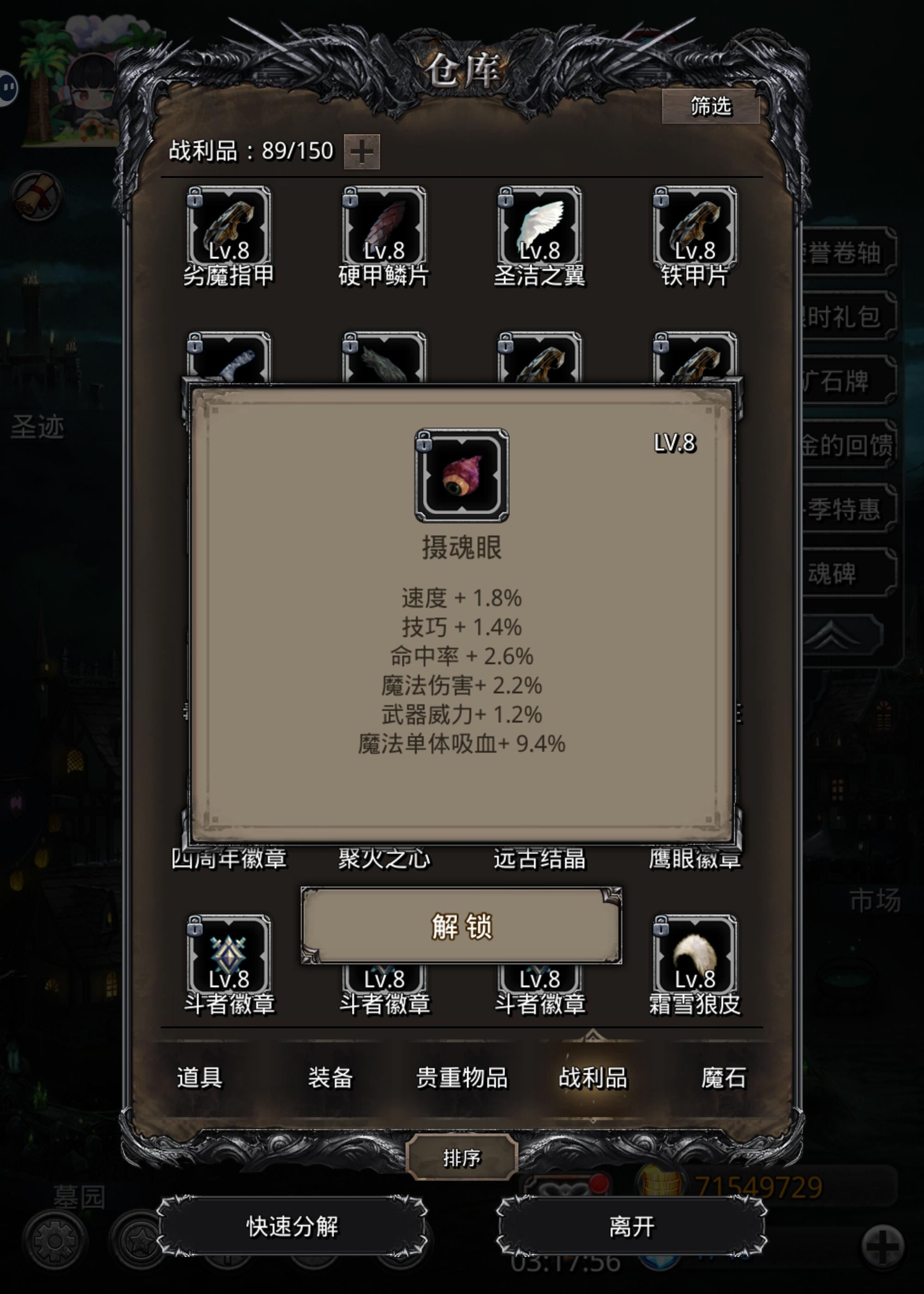 突然在背包里发现一个以前升的战利品,好像还挺极品。话说噬魂眼挺抽象,什么都能出。