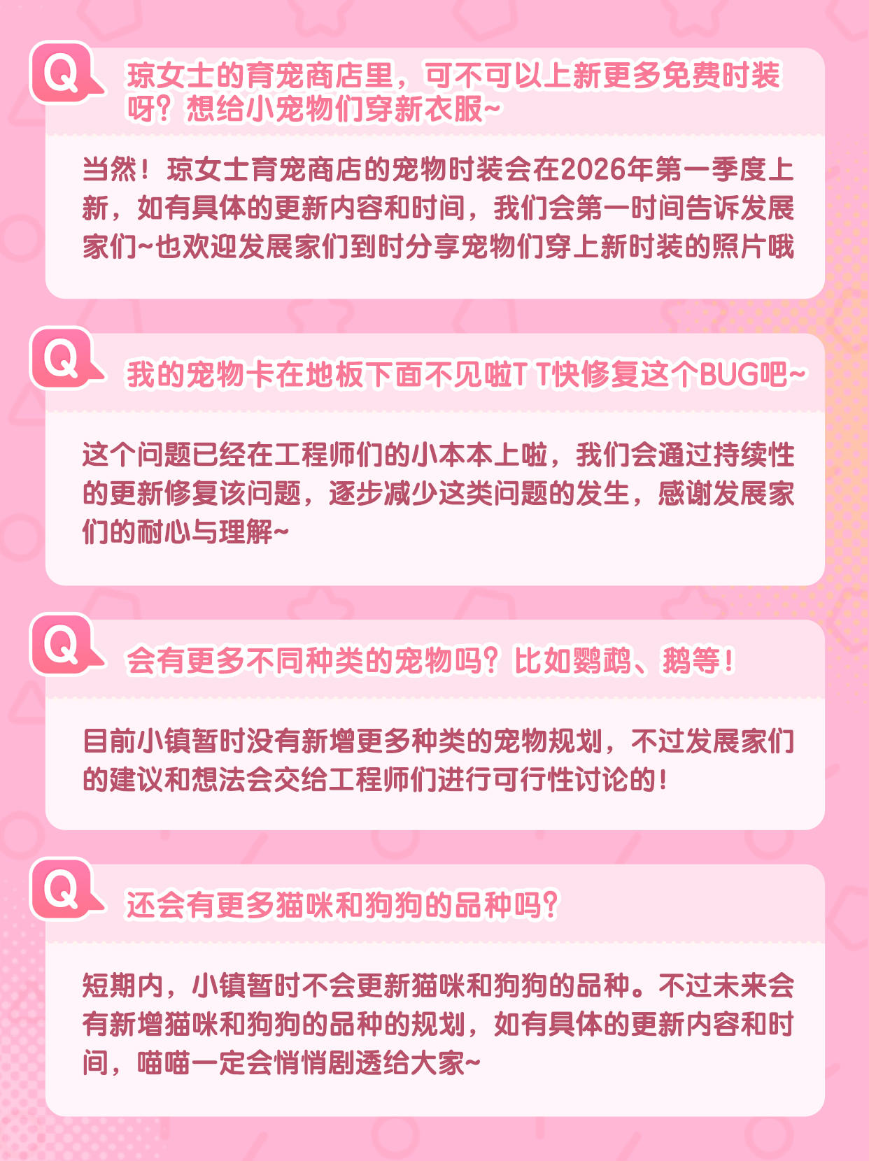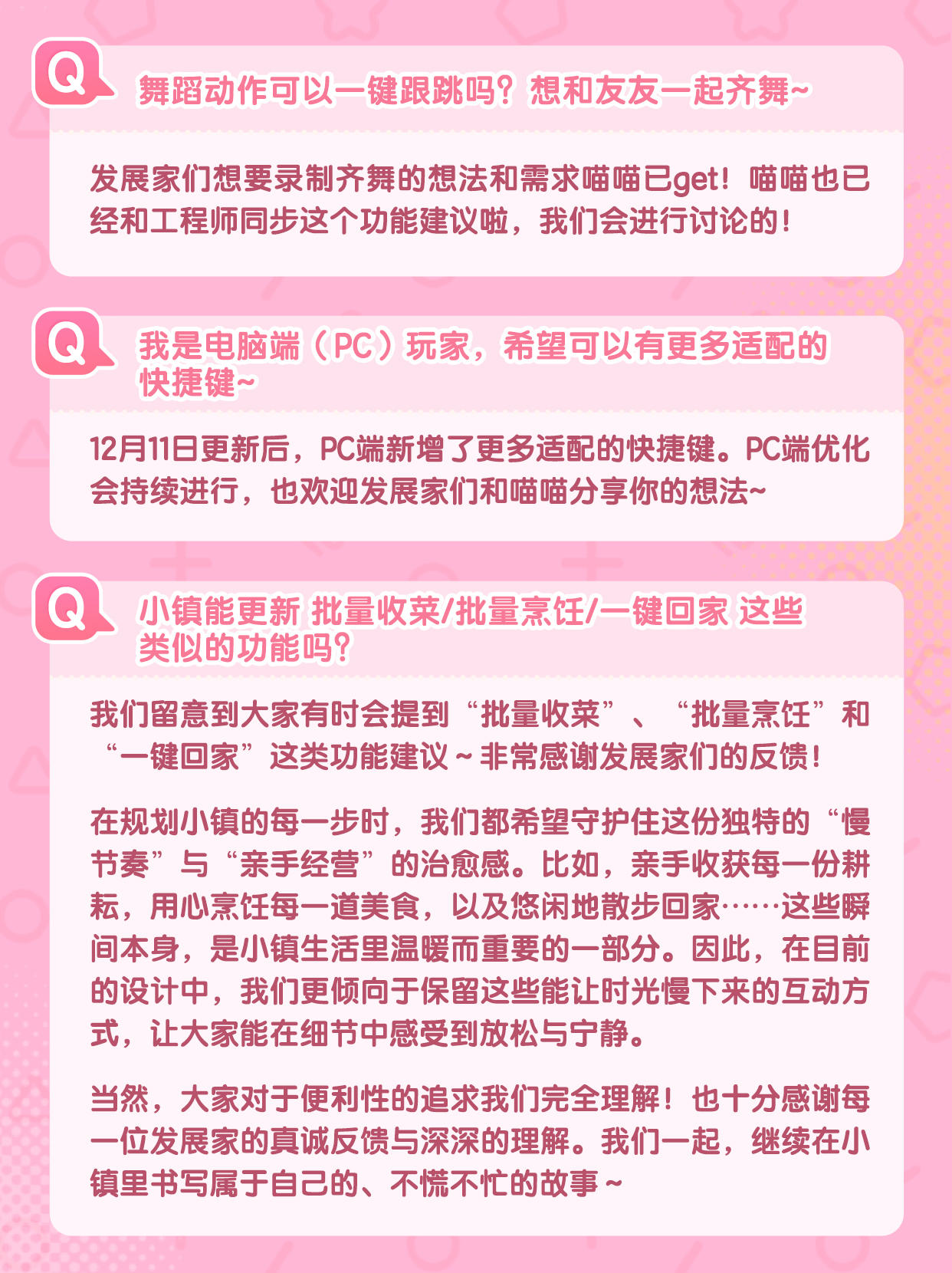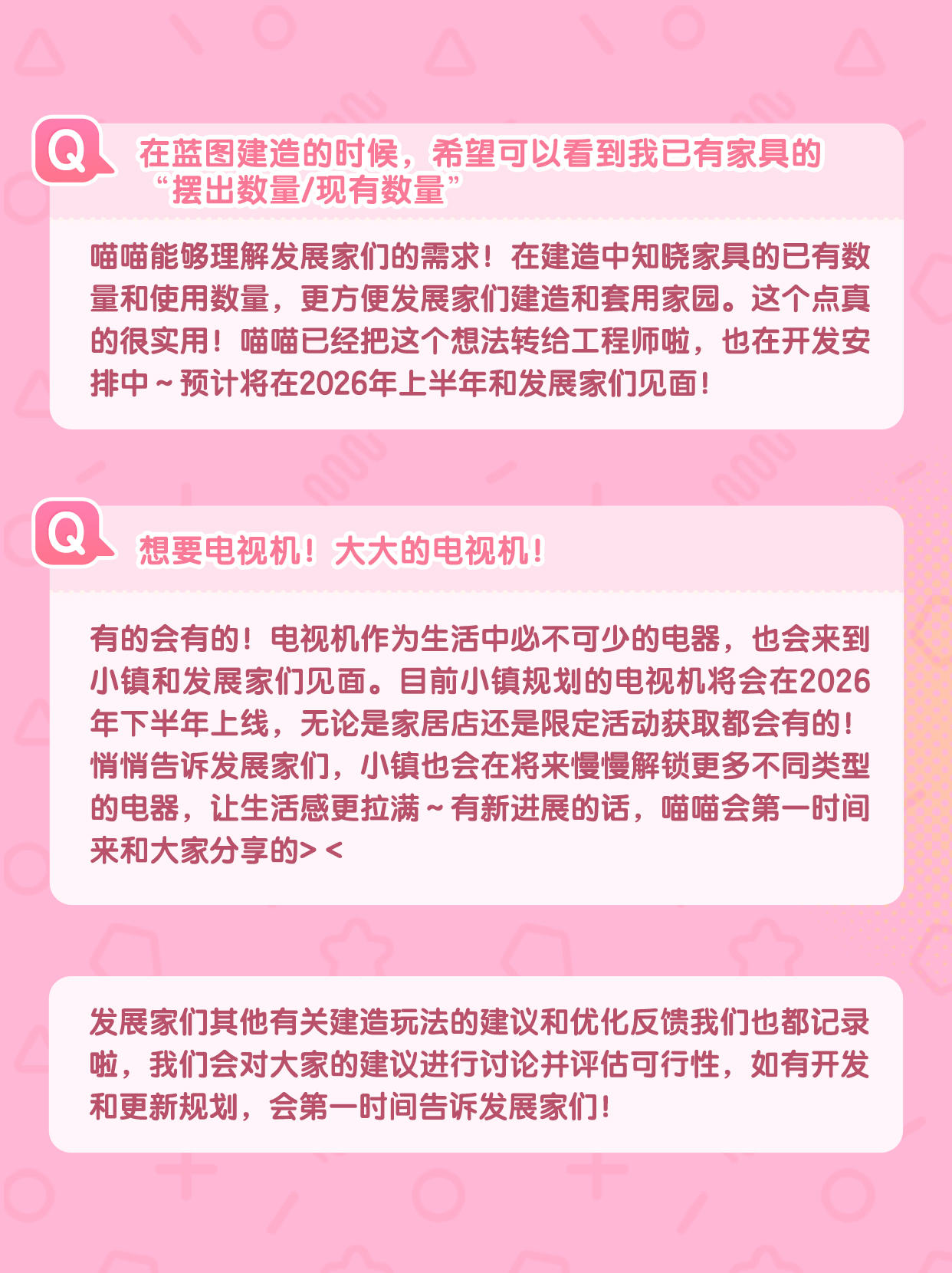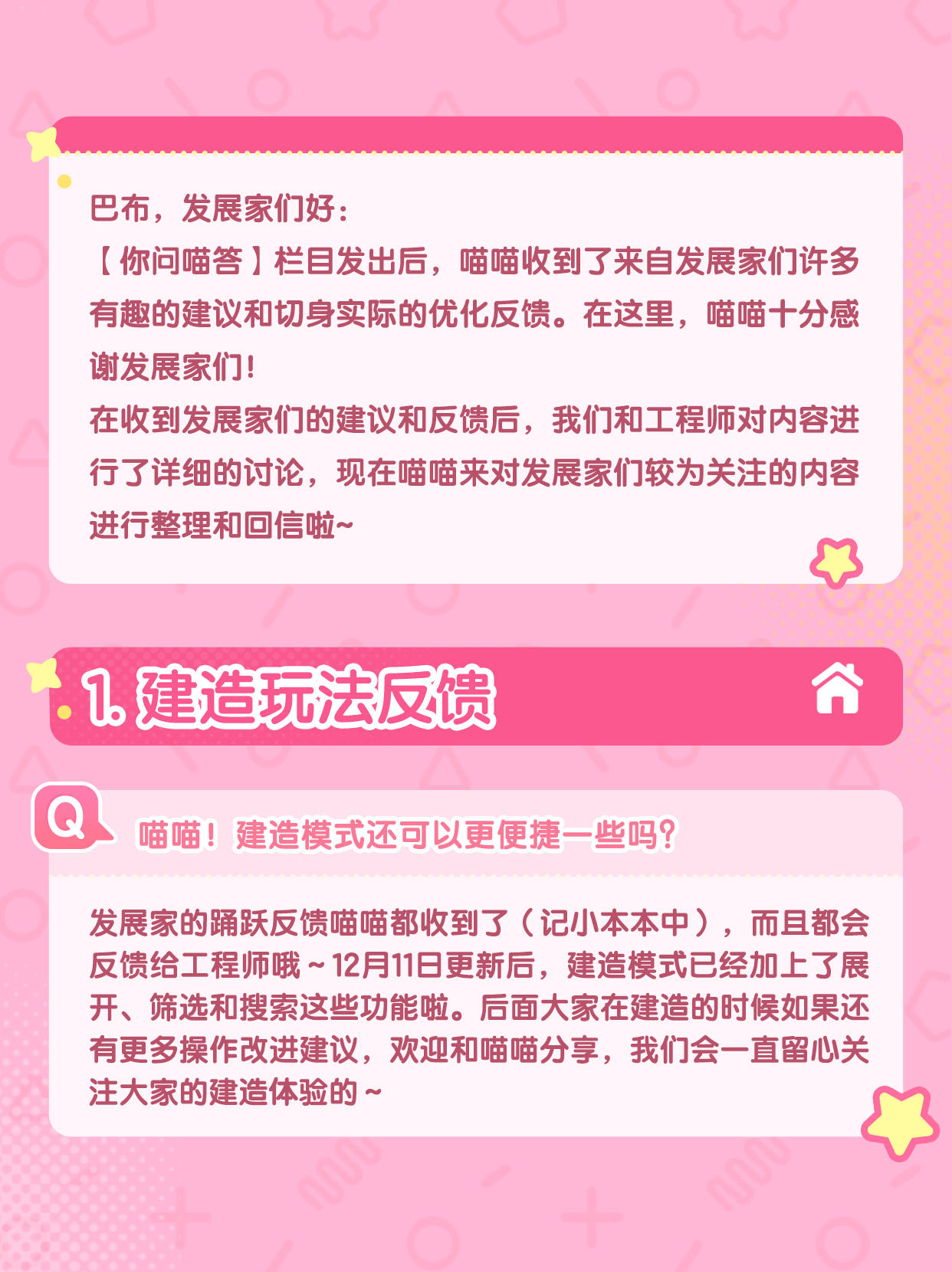 在收到发展家们的建议和反馈后,我们和工程师对内容进行了详细的讨论,现在喵喵来对发展家们较为关注的内容进行整理和回信啦~ 还请发展家们点开图片查看详细内容 🐾