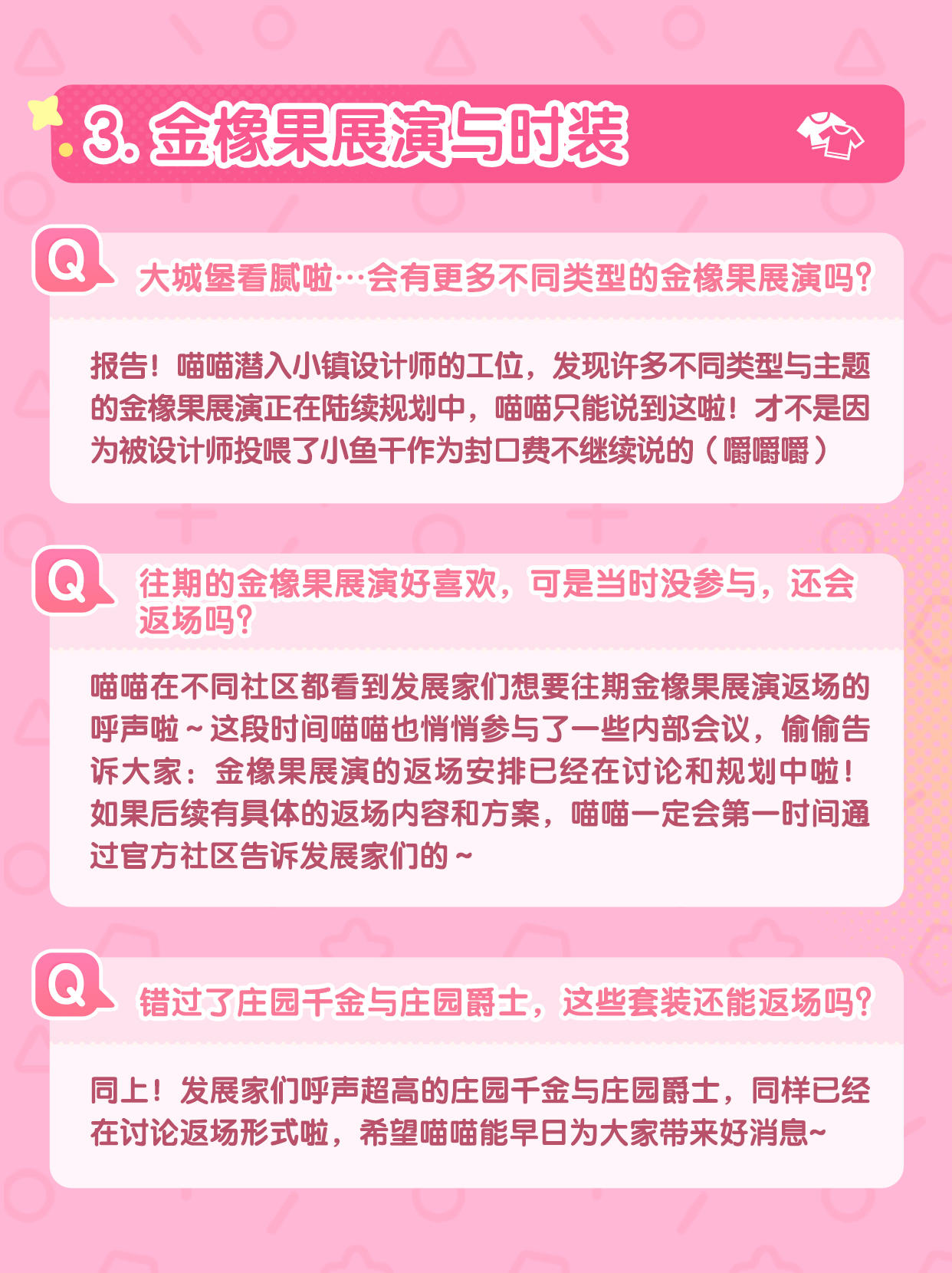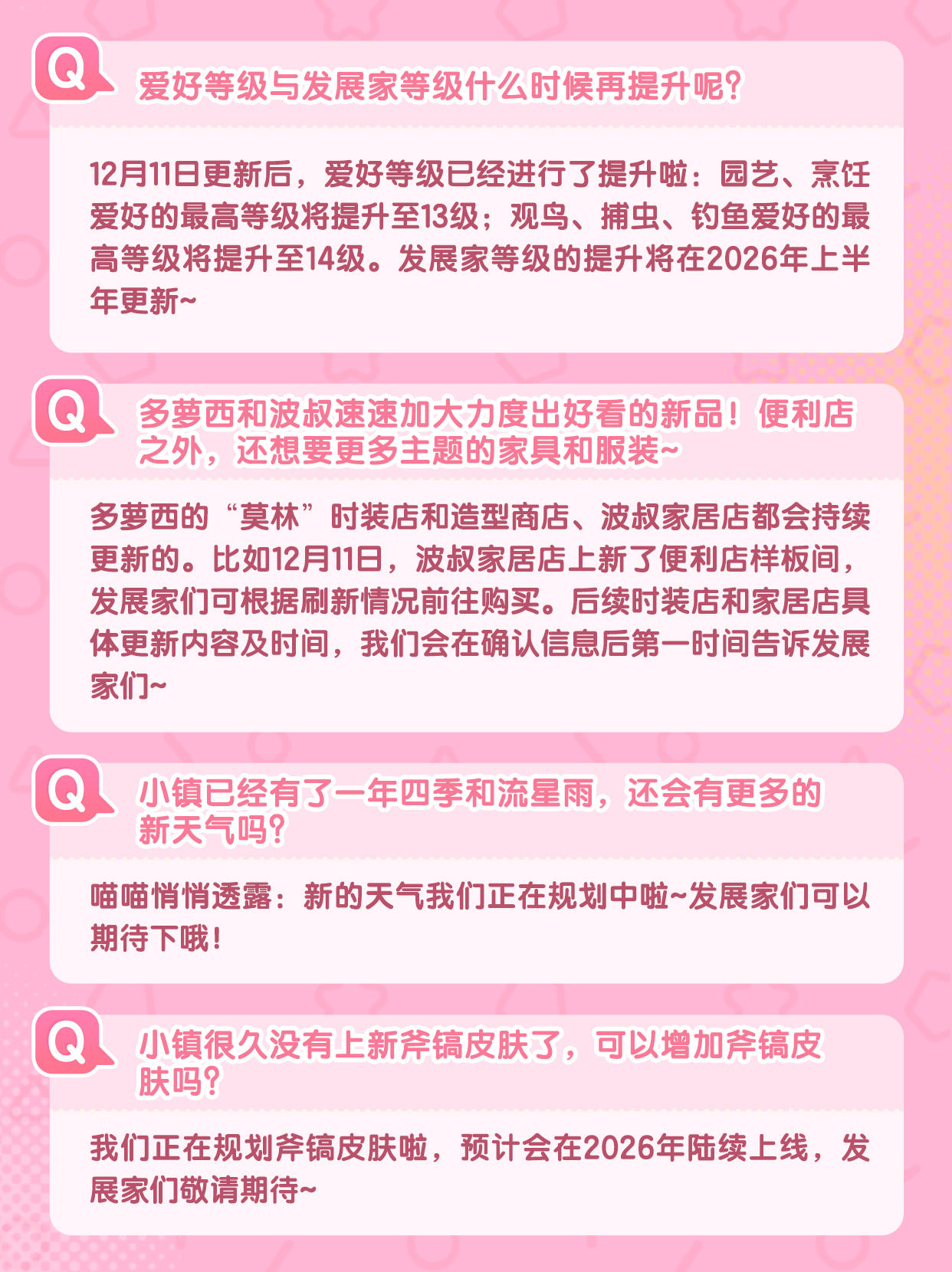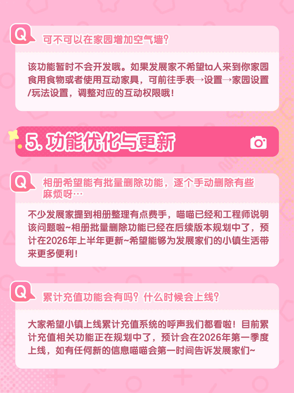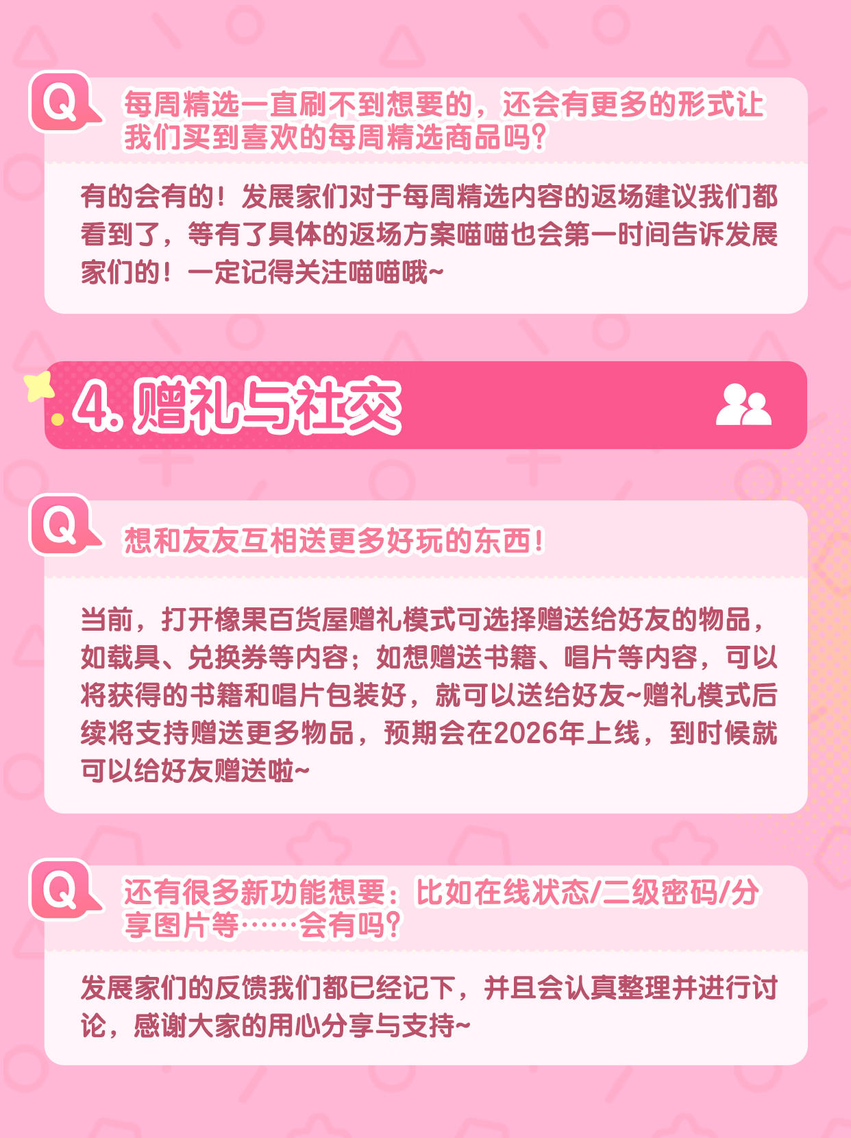 在收到发展家们的建议和反馈后,我们和工程师对内容进行了详细的讨论,现在喵喵来对发展家们较为关注的内容进行整理和回信啦~ 还请发展家们点开图片查看详细内容 🐾