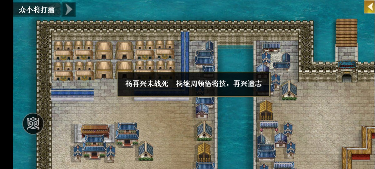 开局岳雷眩晕,吃补心丹,往上迎战冯忠,欧阳从善往下迎战冯孝。二回合韩起龙兄弟出战,三回合关铃、狄雷、樊成出战,回合结束倪完剧情出现,四回合严成方出战,回合结束城内敌军吕柏青出现。樊成去(4.1)拿接骨散,不知道那个打自己的和尚什么鬼,倪完对话岳雷送蛇矛。六回合结束张国乾率敌军下方过桥出战。十回合剧情放千斤闸,回合结束王文炳率敌出战。到达右上右下出现伏兵,严成方占据(33.6)城池,开闸,杨沂中率敌出战。岳雷到达(37.23)-(39.26)过关。