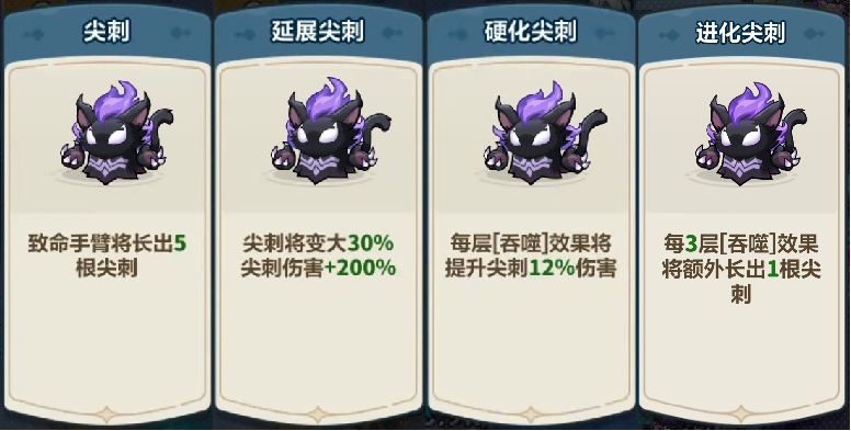 部分吞噬强化会提升吞噬层数上限或提升伤害结果,部分则会作用于尖刺,提升尖刺的数量或伤害,但需要一定的成型时间,不推荐在开局选择。