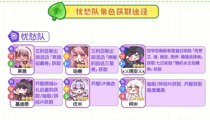 开服UP角色为优米,优先组建忧愁队,获取难度低且上手简单,具体配队可参考对应图示。