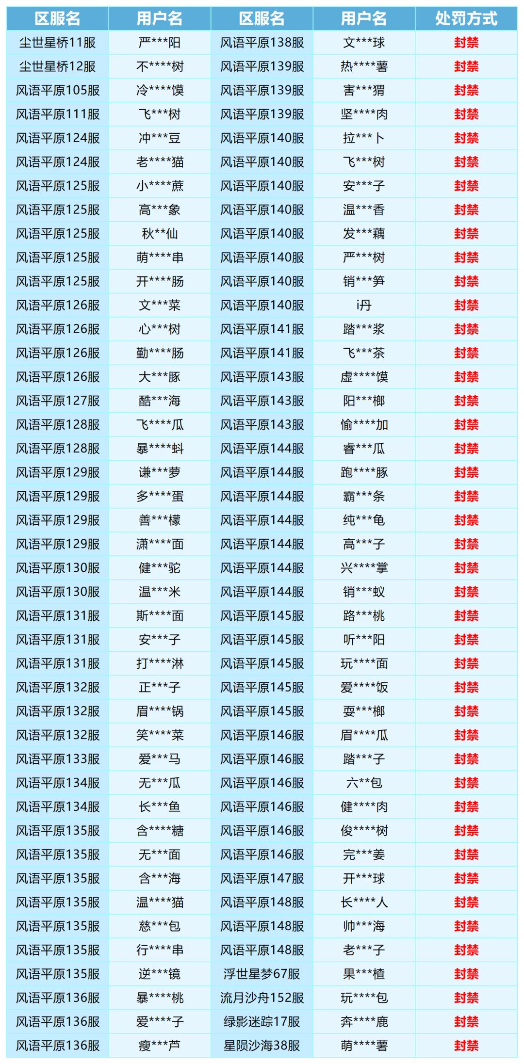 12月11日12:01至12月18日12:00期间,封禁名单公示: