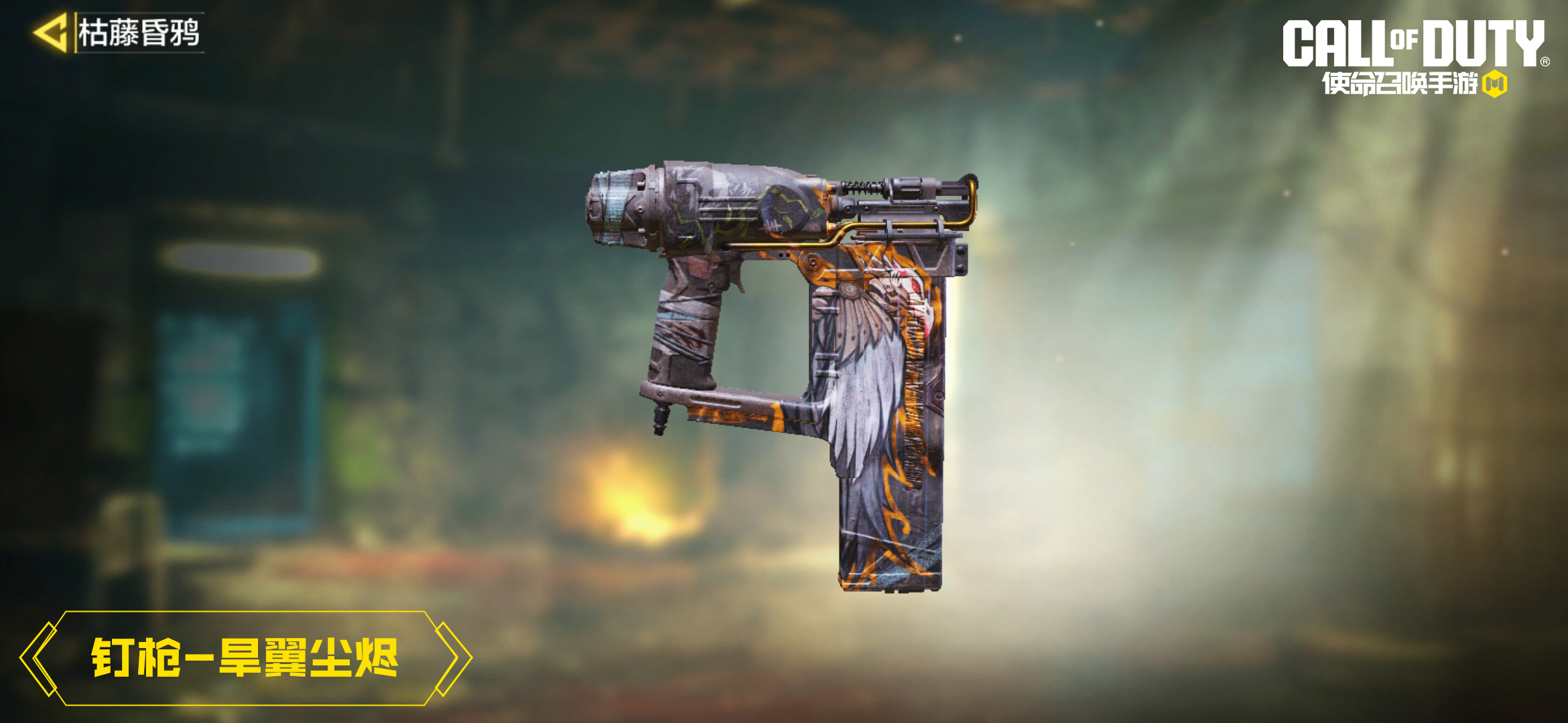 钉枪-旱翼尘烬以灰烬般的暗色调为底,点缀着橙色的火焰纹理,枪身上的鹰翼图案,如同即将涅槃的巨禽,展现出重生与力量。