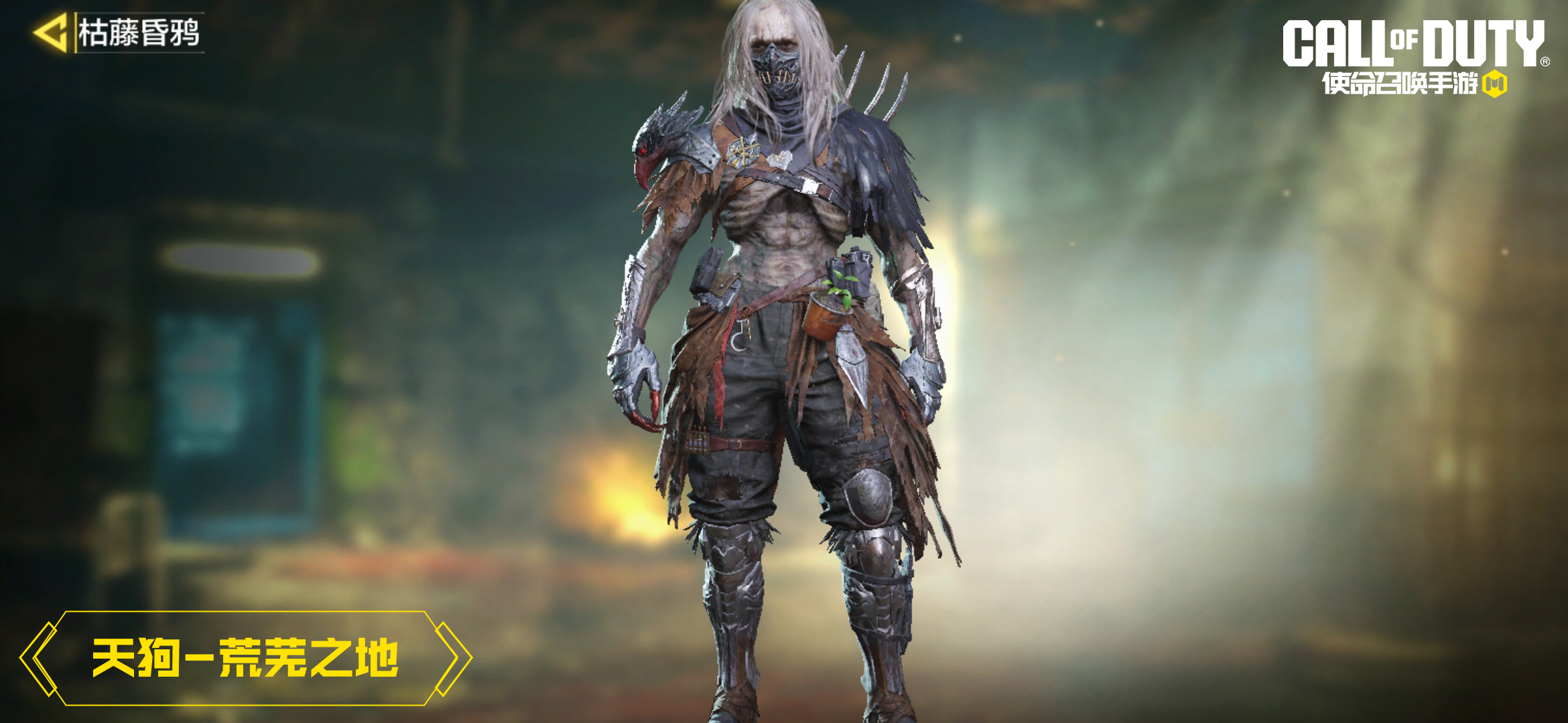 天狗-荒芜之地一头白发,面容枯槁,并带着可怖的面具。他身穿破旧的战斗服,上面装饰着金属护甲和尖刺。腰间别着的盆栽植物隐隐焕发着生机,和他一身颓败气息形成鲜明对比。