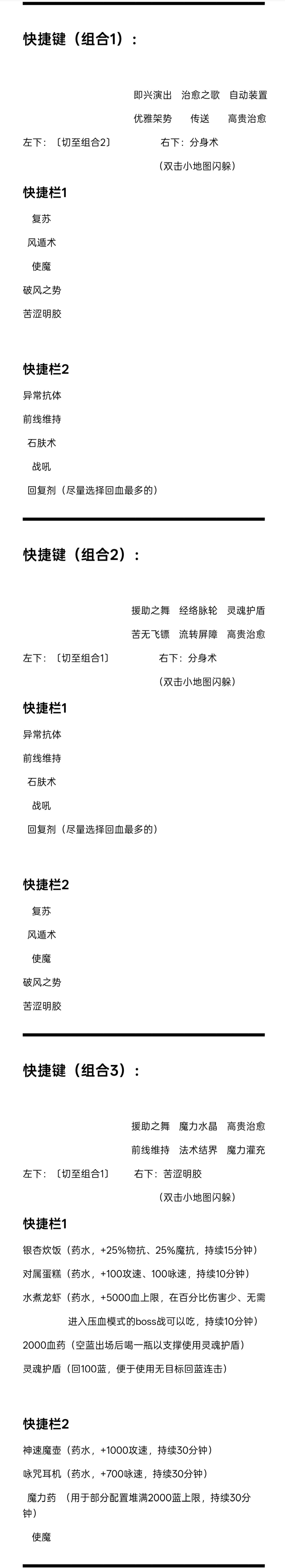 组合1的快捷键放入了开局连和两个buff连,都是战斗中不用频繁点击的技能,只在开局时先通过点按组合1表面快捷键的几个技能完成热机,然后切至组合2进行战斗,使用率偏低的优雅和传送也放到了这里,后续重补buff时才要再切回组合1。