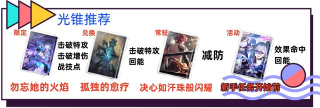 光锥方面,首选自然是专属光锥【勿忘她的火焰】,其次推荐【孤独的疗愈】,四星方面,推荐【新手任务开始前】和【决心如汗珠般闪耀】。