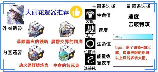 遗器方面,外圈遗器首选【荡除蠢灾的铁骑】,其次是【晨昏交界的翔鹰】四件套,内圈遗器选择【劫火莲灯铸炼宫】和【生命的翁瓦克】。