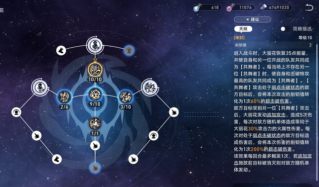 天赋能让开战的队友成为共舞者,共舞者能额外享受60%的超击破倍率,并且另一位共舞者攻击后,大丽花释放追加攻击,回复战技点。
