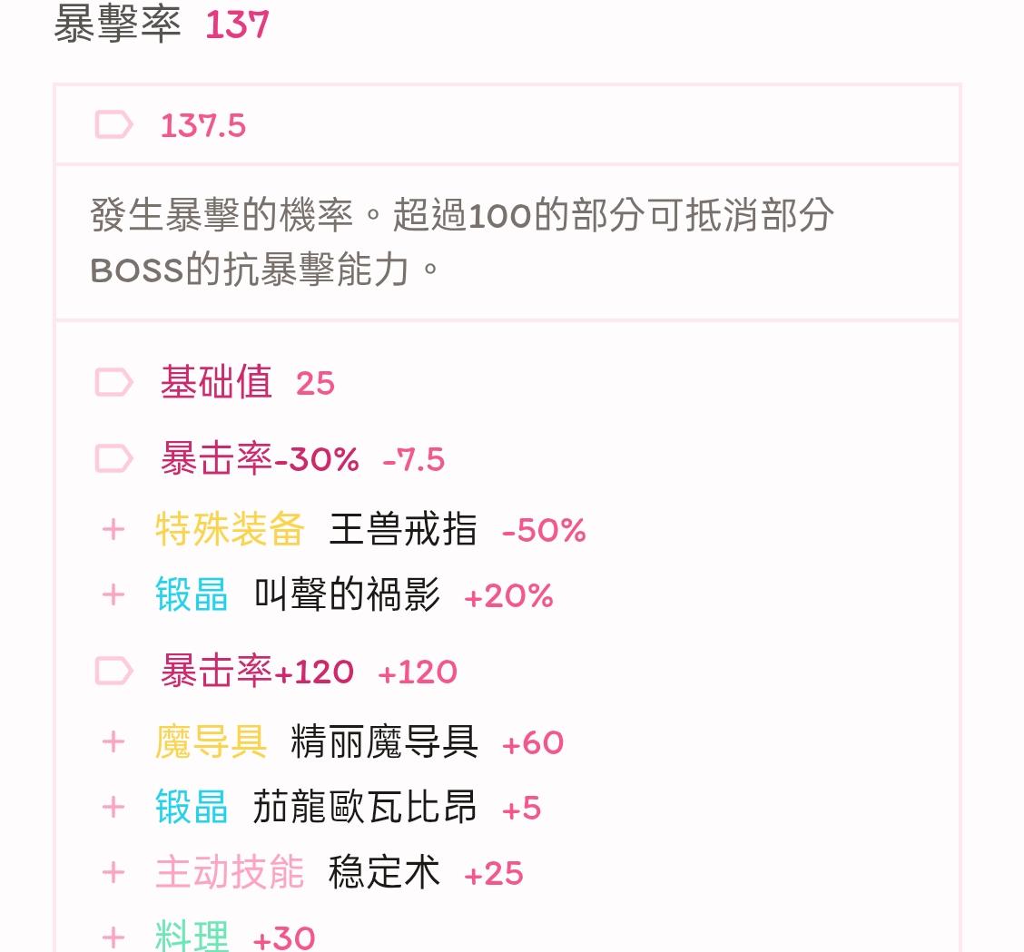 后期高难boss普遍65抗暴,若希望苦无必定暴击从而稳定命中保证叠伤,可以额外吃一个章鱼烧堆到165暴击。