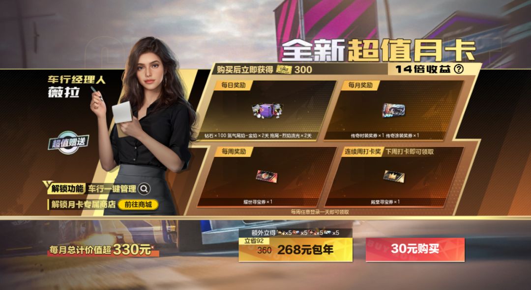 月卡原价30元/月,福利加码不加价,续订仅需28元,性价比再升级!还有新增268元包年套餐,一次开通畅享12个月稳定福利,适合长期驰骋赛道的赛车手,省心更划算!