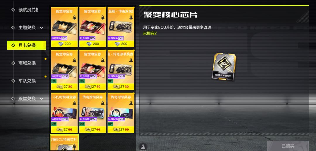 开通月卡后即可解锁专属兑换通道,赛车手们可点击月卡兑换商店,以钻石或折扣点券兑换殿堂寻宝券、耀世寻宝券、至臻·传奇涂装奖券、传奇涂装奖券、不朽时装寻宝券、传奇时装奖券、聚变核心芯片等多种稀有道具。