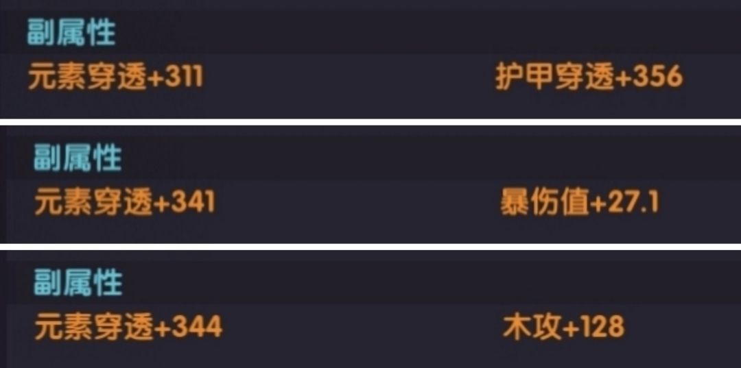 副属性选择:元素穿透+暴伤值/属攻/护甲穿透(护甲穿透只限前期洗,中后期一律洗成爆伤/属攻)