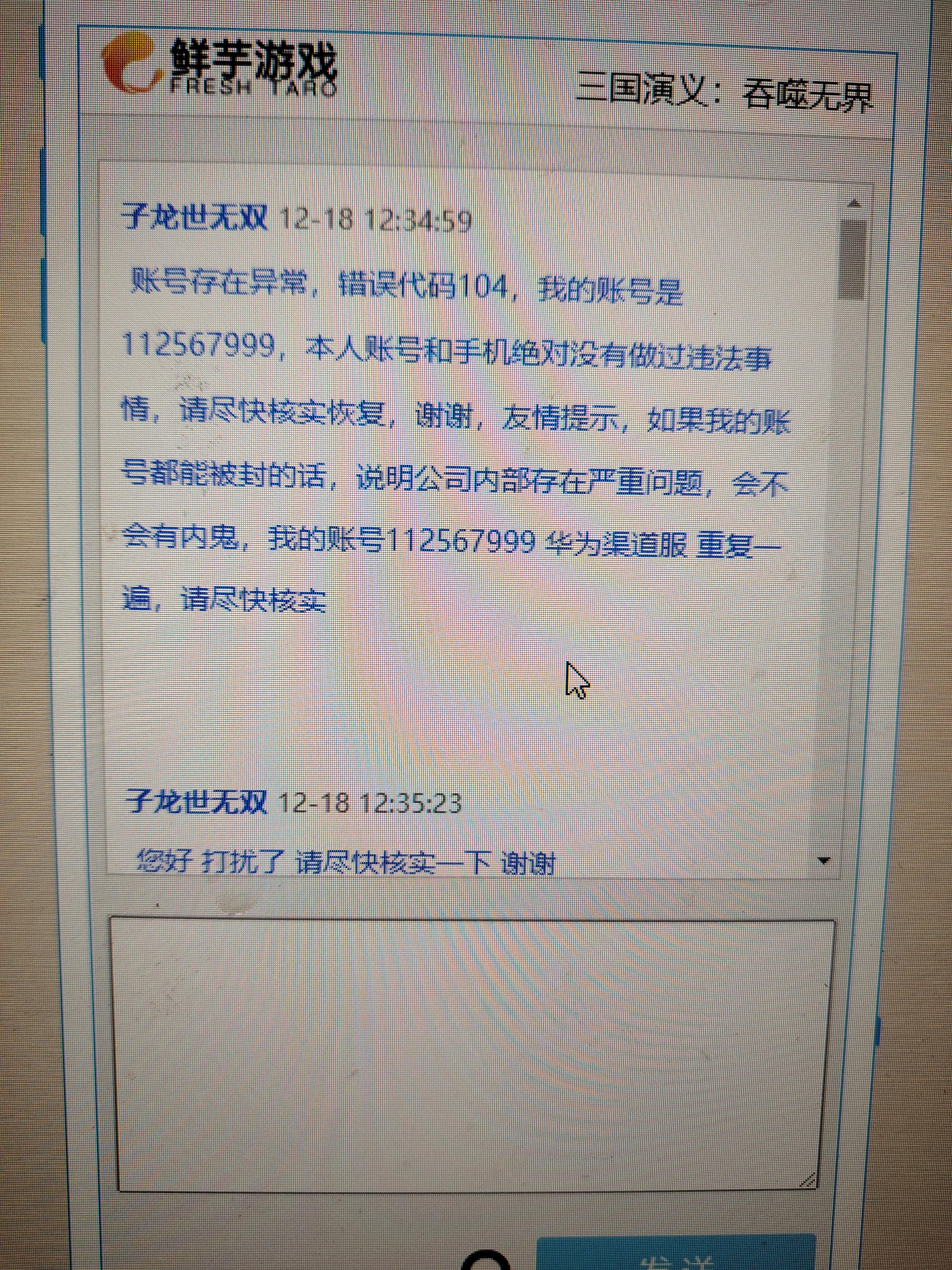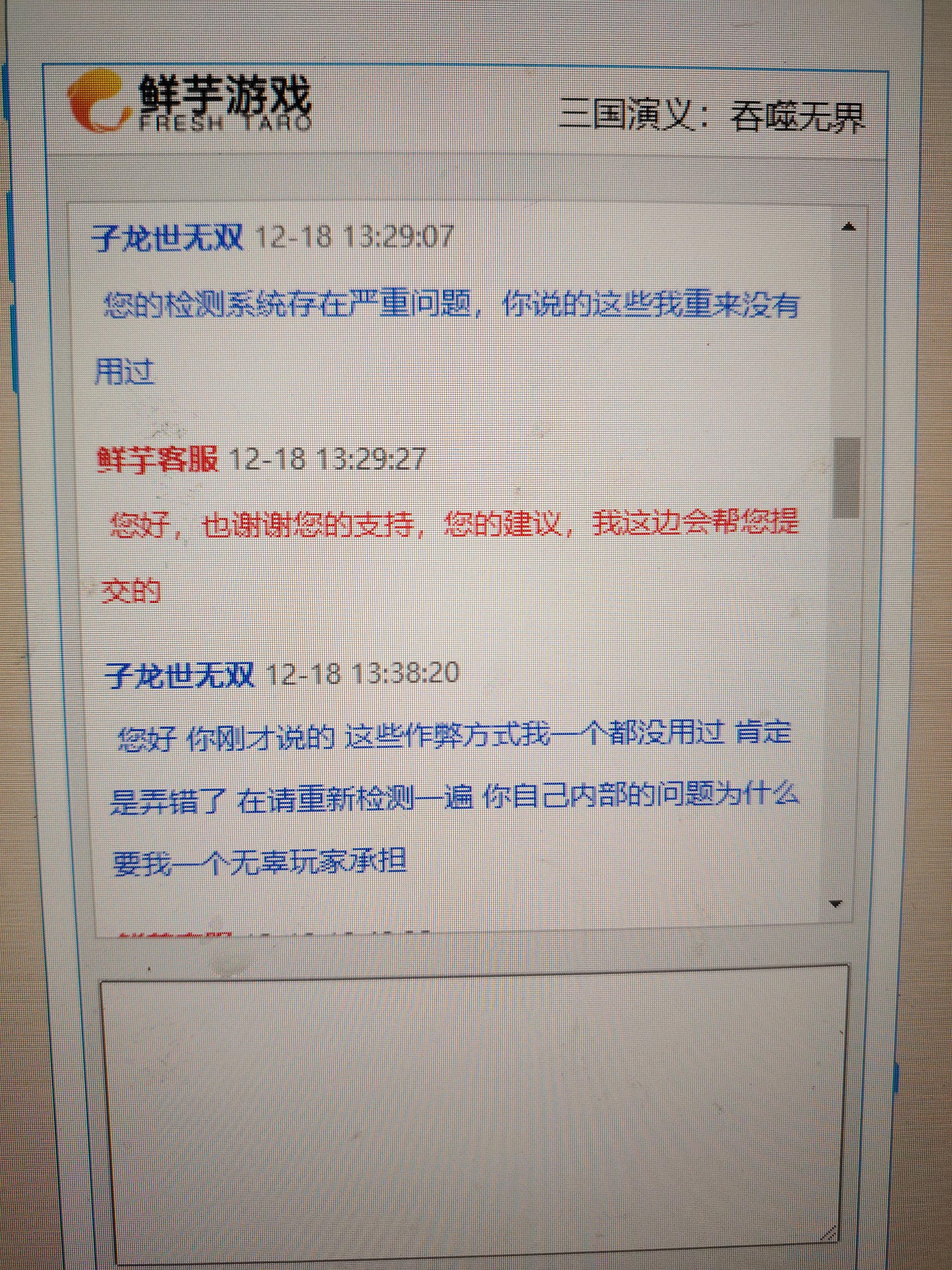 我就想质问一下鲜芋,如果你说我用了虫虫,我的手机就没有安装过这个软件,怎么可能会用到,完全是某个管理者的人为,而且这个管理者我还有他微信号,他如果能看到也知道我在说他,还一直在我们吞噬无界平民群,实在不想点穿,毕竟有些东西我看破不想说破,能让管理者认识到玩家真实感受,也不是什么坏事情,公司运营游戏都是要成本的,但是起码也不能乱来啊