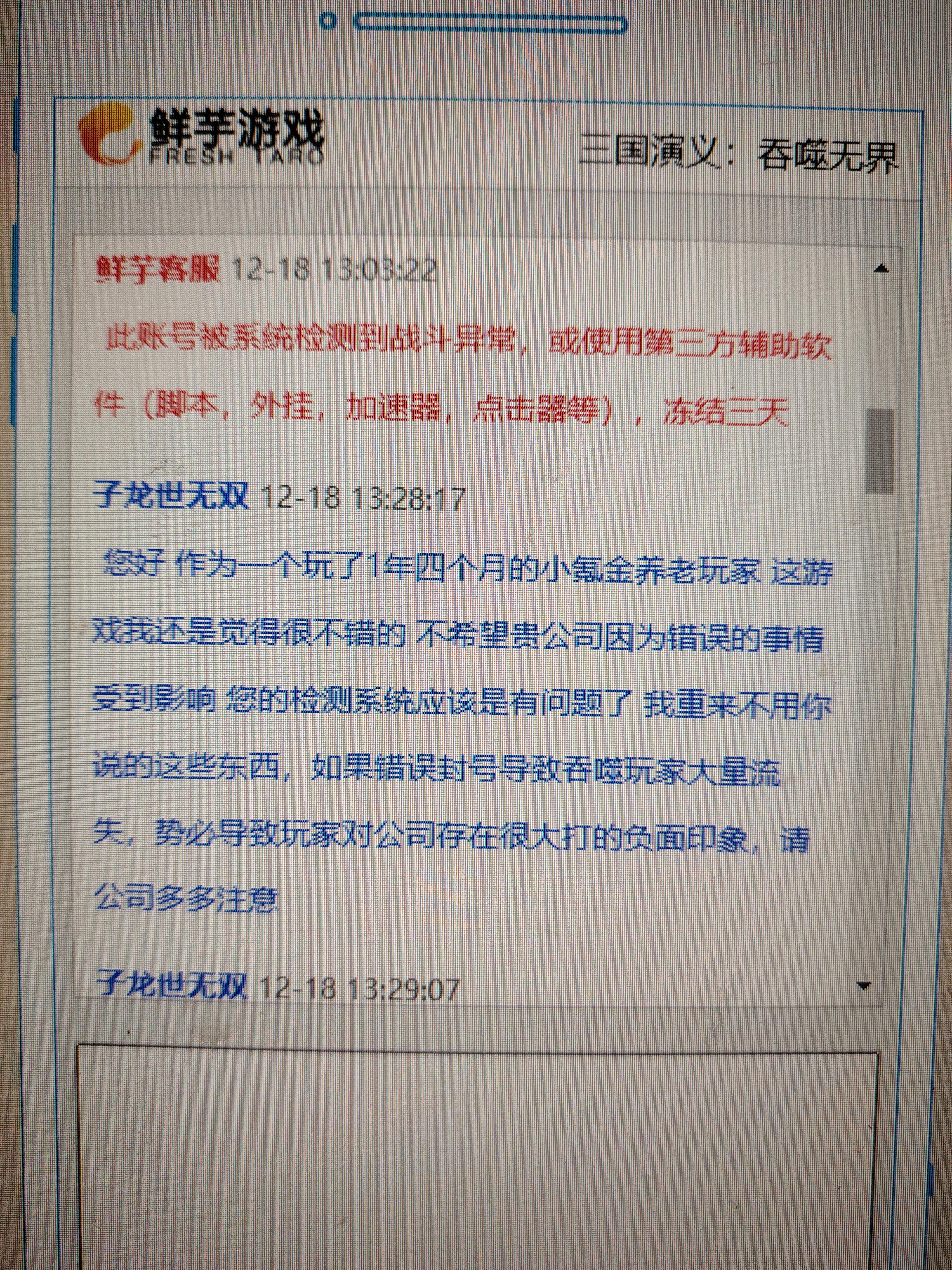 接触吞噬无界这个游戏一年四个月 觉得这个游戏收收菜养养老慢慢培养也蛮不错的,哪知道今天中午账号突然被封了,反馈给客服,这是谈话内容,你们可以看一下