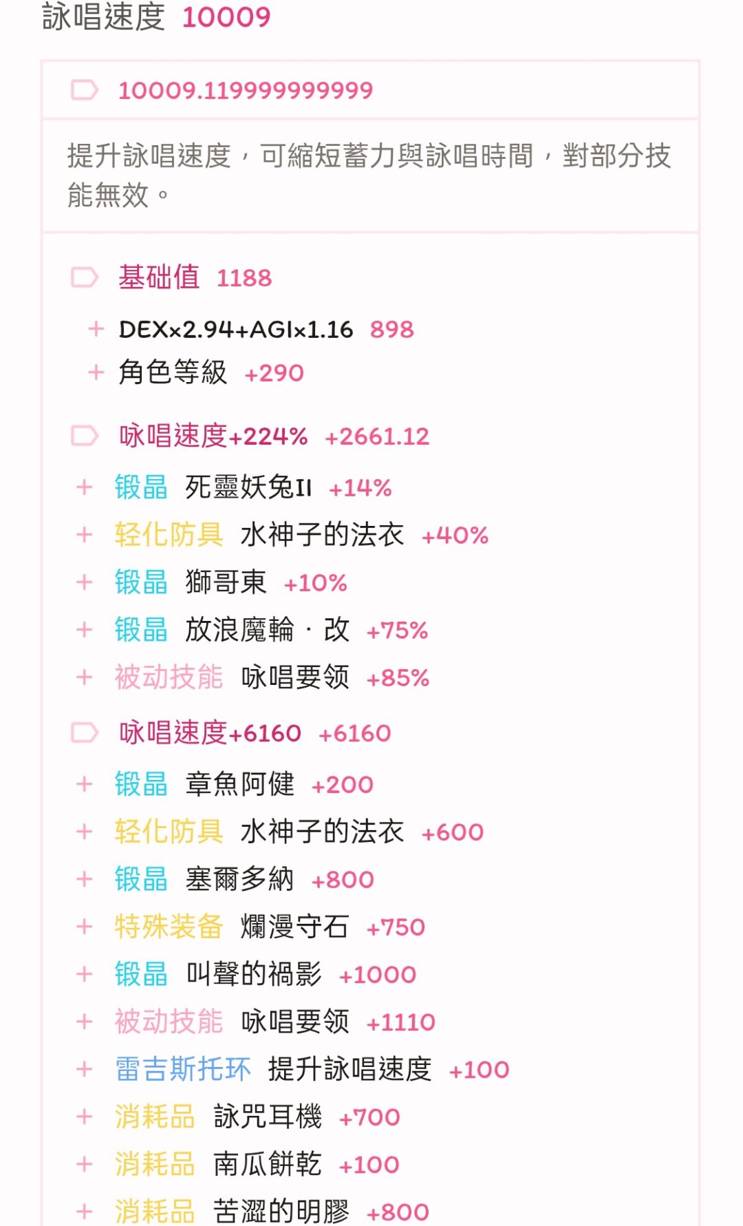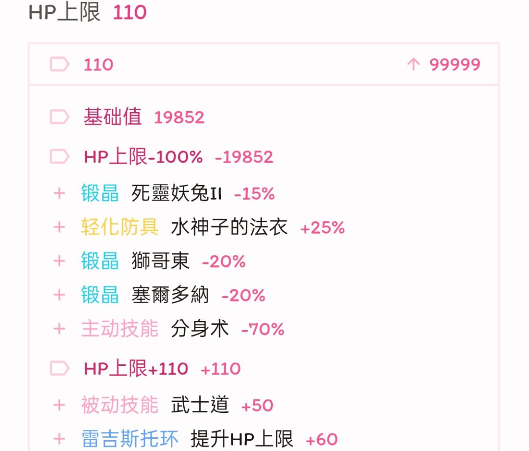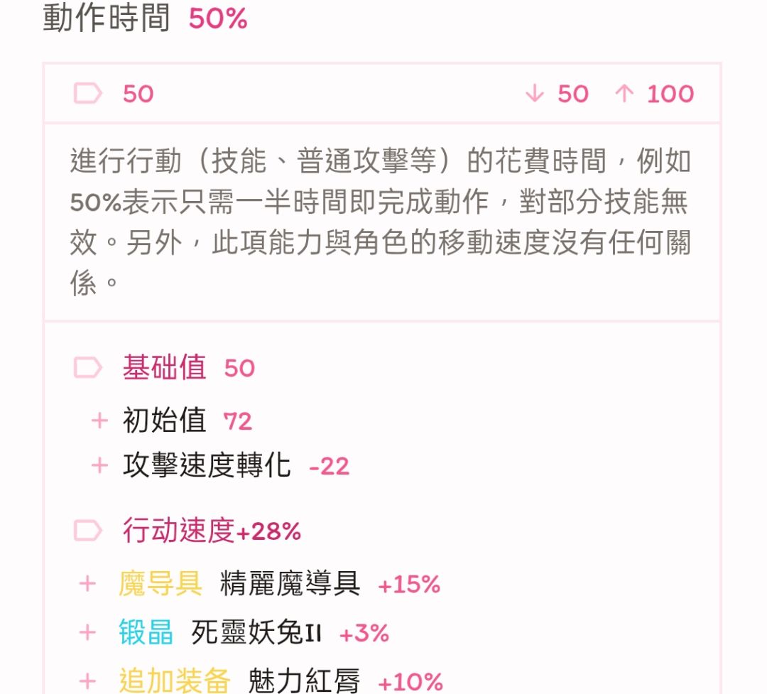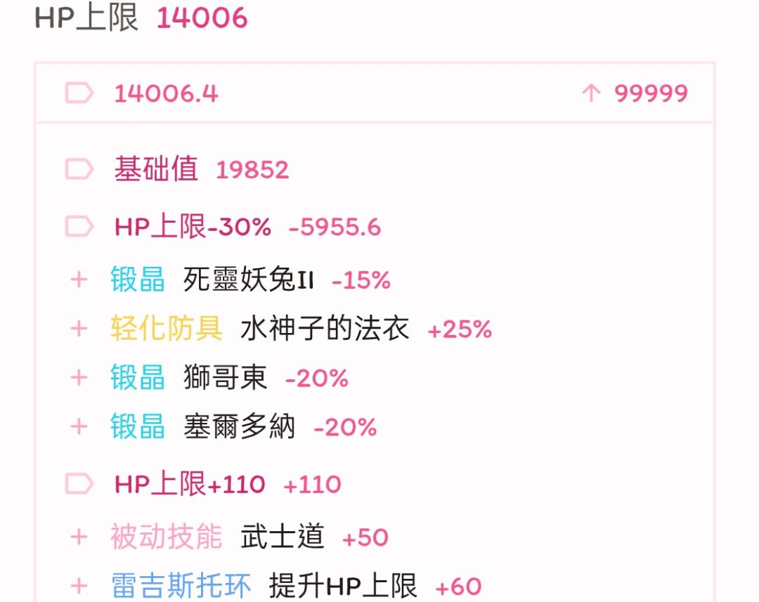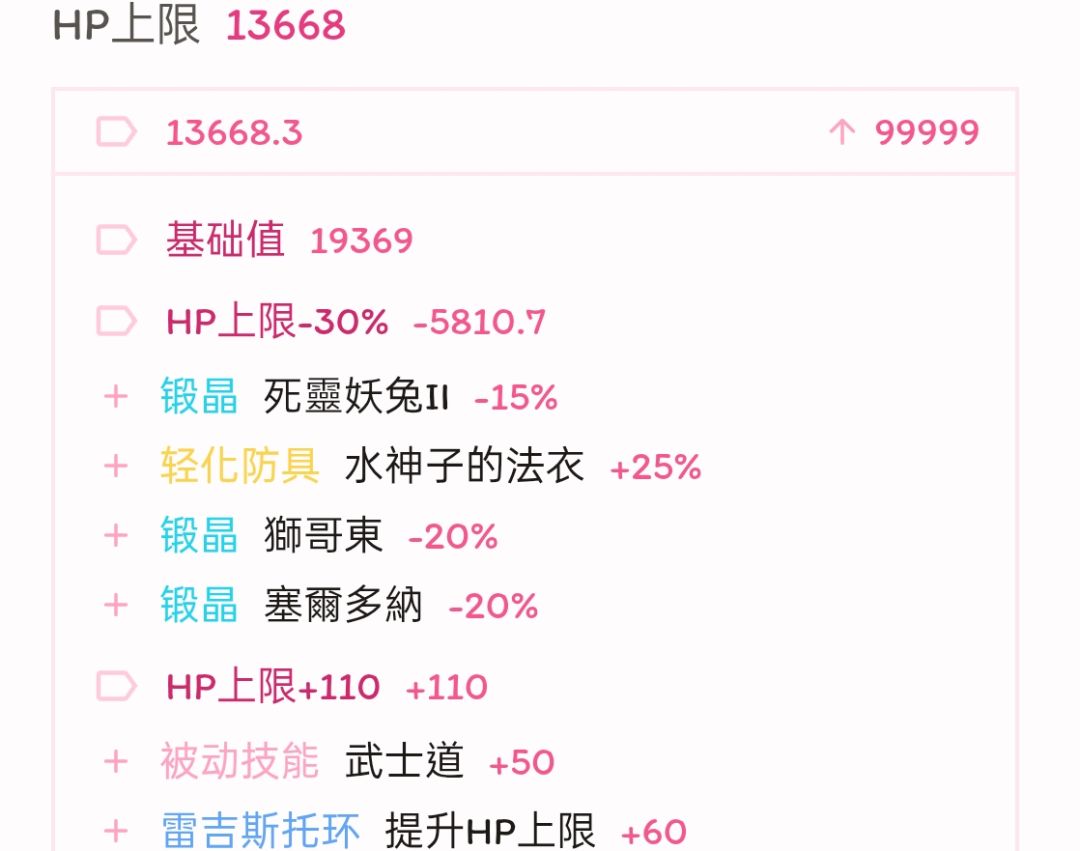 面板方面,为保证换成王兽以后血量不降低太多,只能退一步选择把行速与咏速都卡在离堆满差1%,这1%的差距实战中不会有什么影响,但省下的点数补给耐力能抬回不少血量,最终常态模式血量为一万三、暴击147,其余属性基本不变。