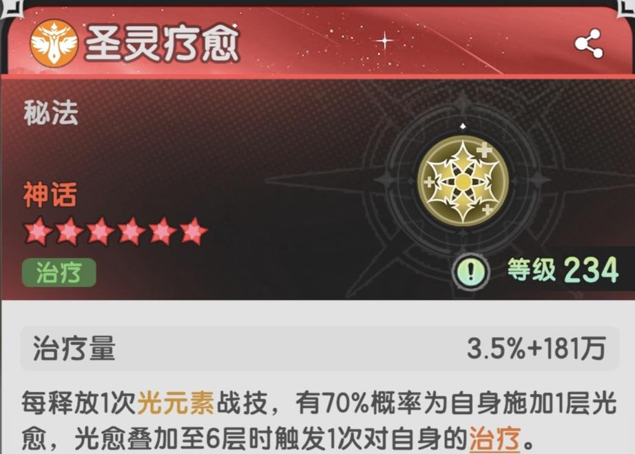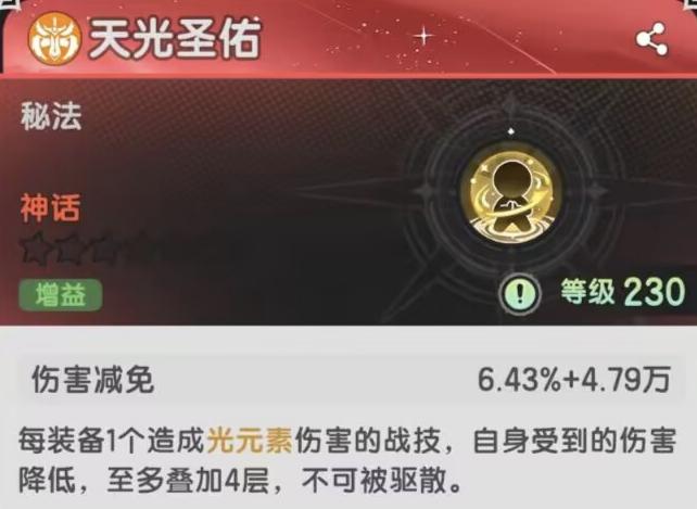 2.天光圣佑:很搞笑的一个秘法,和五转的光愈一个性质,我都带4个光元素伤害战技了,我还带你一个减伤干啥?算上光愈这已经是2个抽象光秘法了,给光骑出一个好用的光秘法就这么难