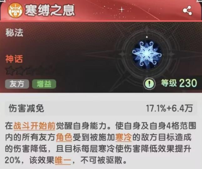 5.寒缚之息:必须带寒芒才能启动的群减伤秘法,好残废的秘法。同时还得带几个水元素战技+熊猫才能叠起来。水元素战技基本都是用来打伤害的、寒芒也是输出秘法,然后你却是一个群减伤秘法,我带一堆输出技能和秘法只为触发这个群减伤秘法,何意味?