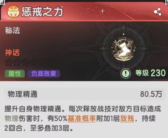 6.惩戒之力:物理精通,老实说现在真的有4个技能全带物理的骑士吗,基本都会带个水刀和打伤害的光战技,到六转估计也是物光混带,物理精通还是太局限了。不过有一个致残debuff(好像是降低行动力),有一定的控制作用,打副本没人带,估计挑战赛会有用