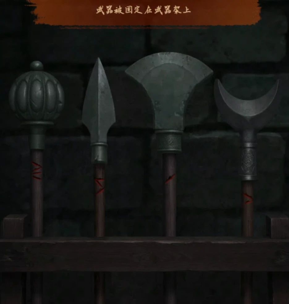 右边的桌子上有一个盒子是四个图形密码,我们再去看一下武器架,每一个武器上划痕是不一样的,我们不管武器的手柄部分只看上面形状,第一个划了4道的是个球形,第二个划了3道是个菱形,第三个划了1道是个扇形,第四个划了2道是个月牙形,所以我们就获得了一个图形密码【扇形-月牙形-菱形-球形】,调整一下这个盒子如下图打开拿到【将】棋子和【墨条】。