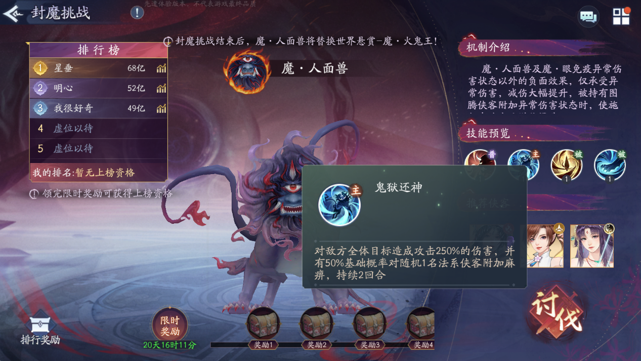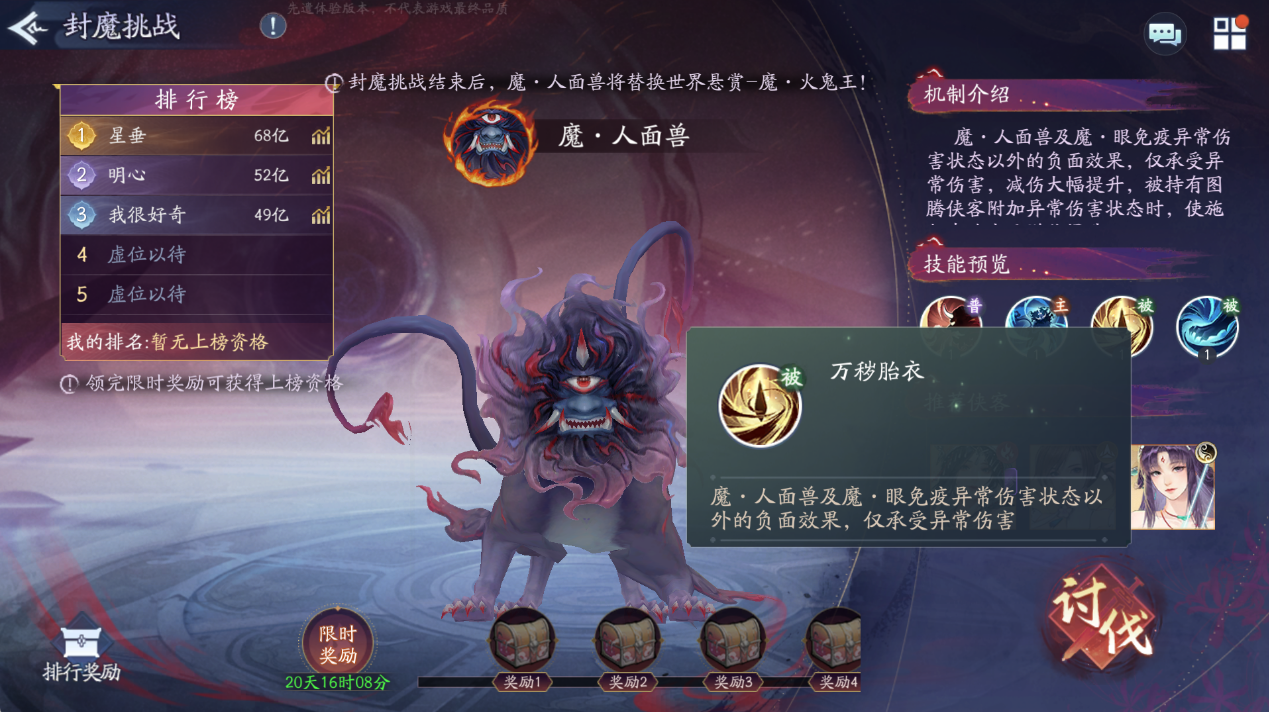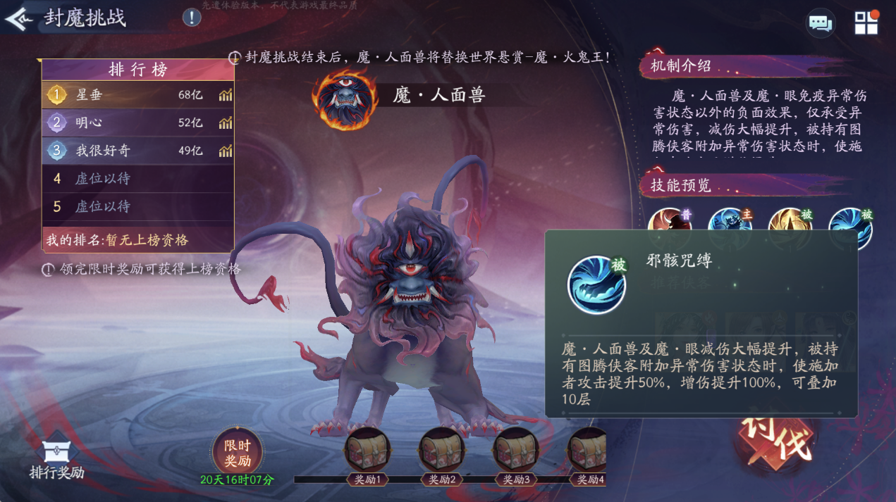 我们一起来看一下本次新赛季魔·人面兽的挑战机制