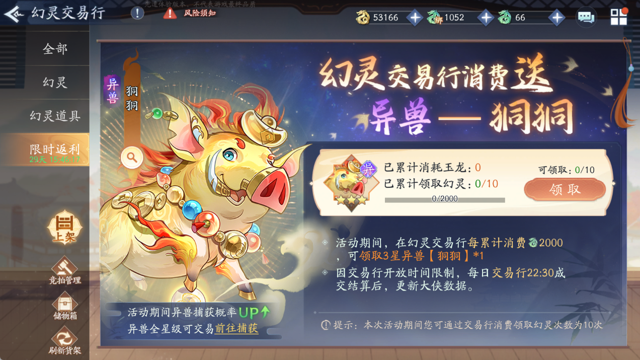 (3)幻灵交易行每累计消耗玉龙*2000,可领取3星异化幻灵狪狪*1,可累计领取10次