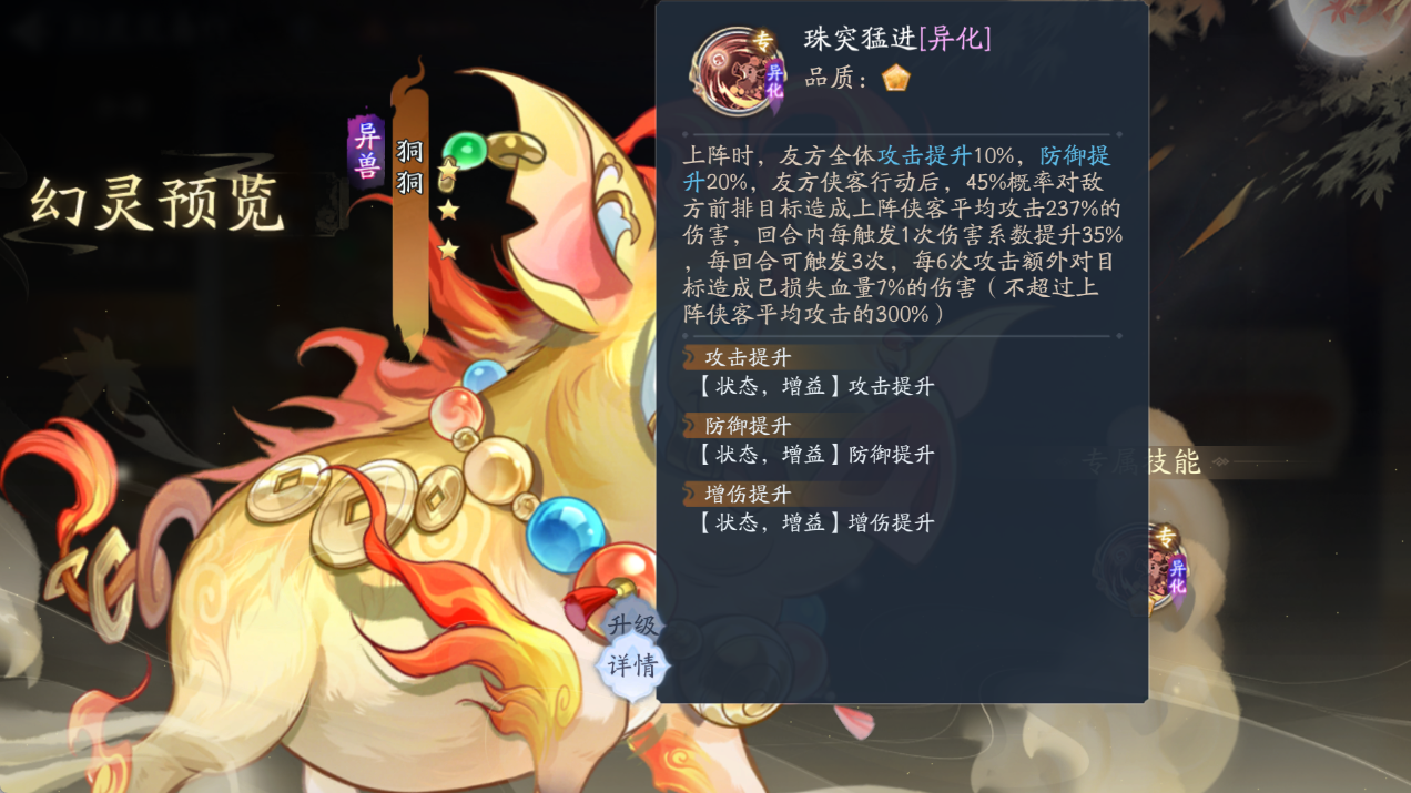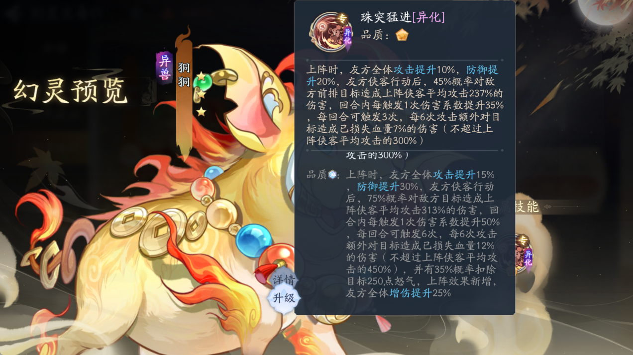 【珠突猛进】这是一个比较强势的攻击型技能,提升友方全体攻击与防御,对敌方目标造成上阵侠客平均攻击百分比的伤害,回合内每触发1次均有伤害系数提升,且每回合可触发6次,每6次攻击额外对目标造成已损血量百分比的伤害,可移除魔·长鞭魔女的特性——【凝丝】,并有概率扣除目标怒气,白色品质带有提升增伤的新增效果,属于攻击型较为强势的幻灵技能