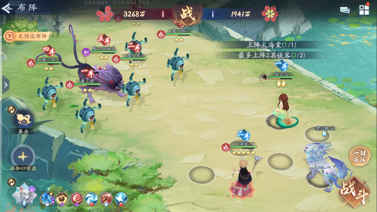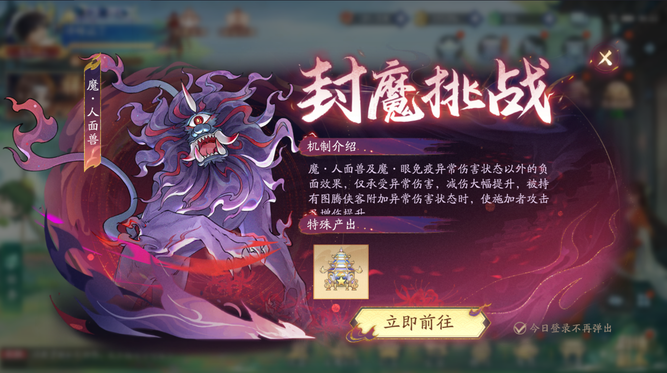 根据封魔挑战魔·人面兽的特性,建议大家使用带有图腾效果的侠客上场挑战