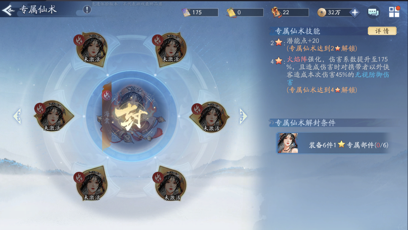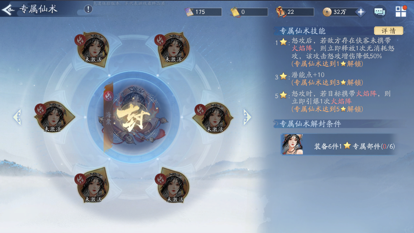 专属9★. 火焰阵强化,伤害系数提升至 175%,且造成伤害时对携带者以外侠客造成本次伤害 45% 的无视防御伤害(专属仙术达到 4★解锁)