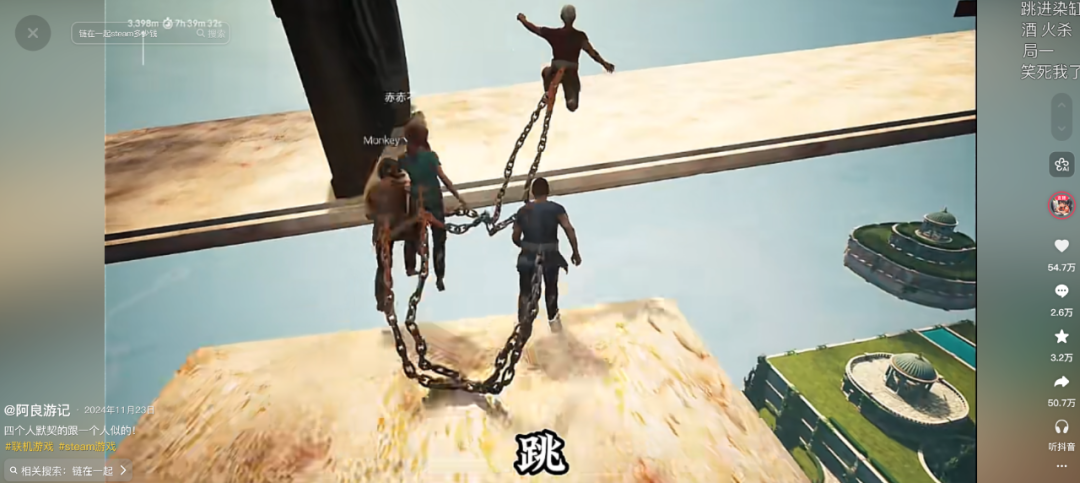 很多人还记得多年前《掘地求升》带来的“看主播受苦”的快乐,而这种快乐你很容易能在“阿良游记”的视频里找到。在游玩《Chain Together》(链在一起)或《Peak》这类多人合作游戏时,屏幕里充满了此起彼伏的尖叫和互相甩锅的怒吼。